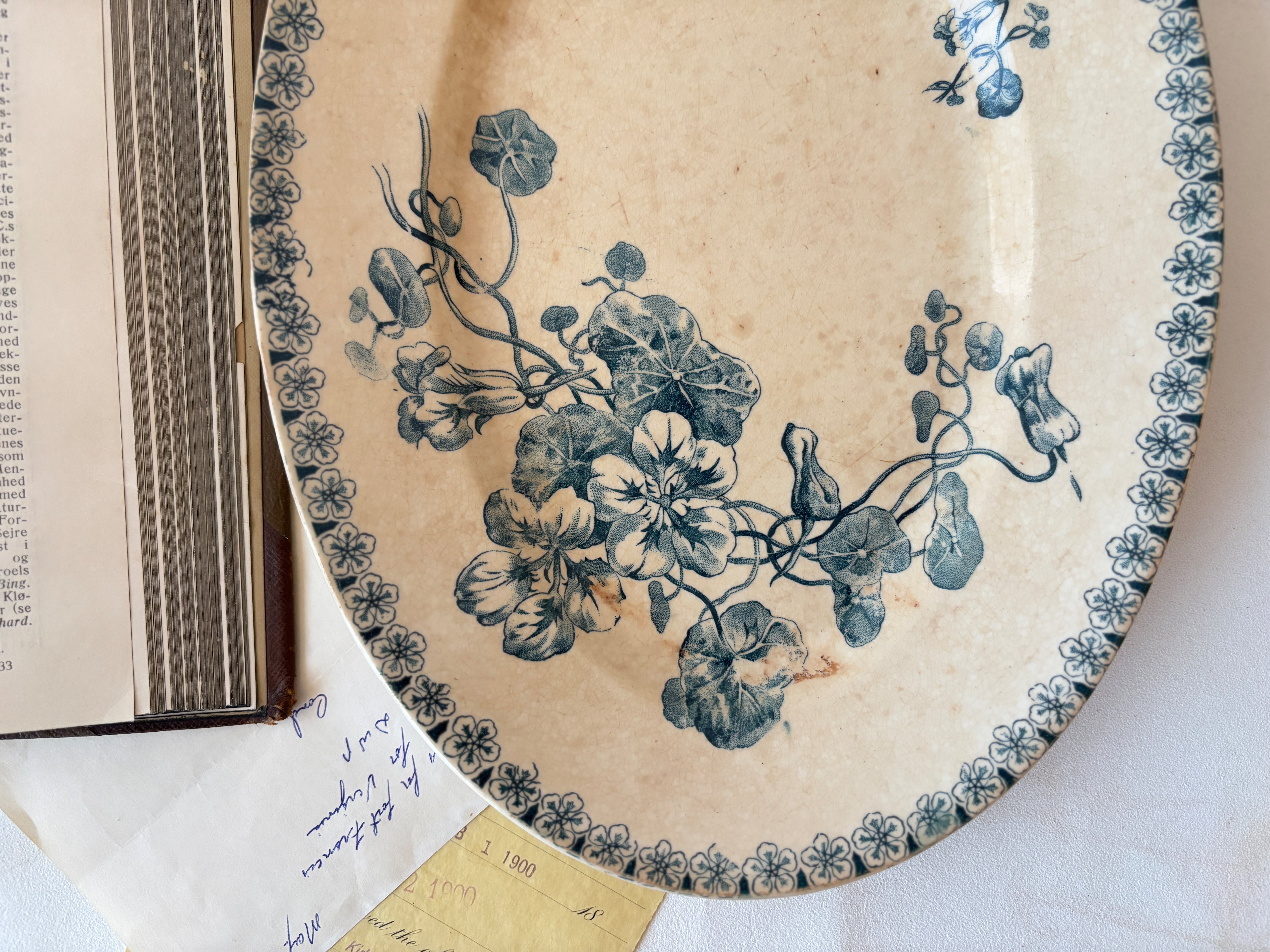 美しく枯れた古手のプレートで、細やかな貫入と色づきが相まってアンティークならではの魅力を醸し出しています。一部に色滲みや小さな焦げ跡がありますが、経年による味わいと使いやすいサイズ感、裏面のシャビーな雰囲気も抜群で仕入れずにはいられませんでした。