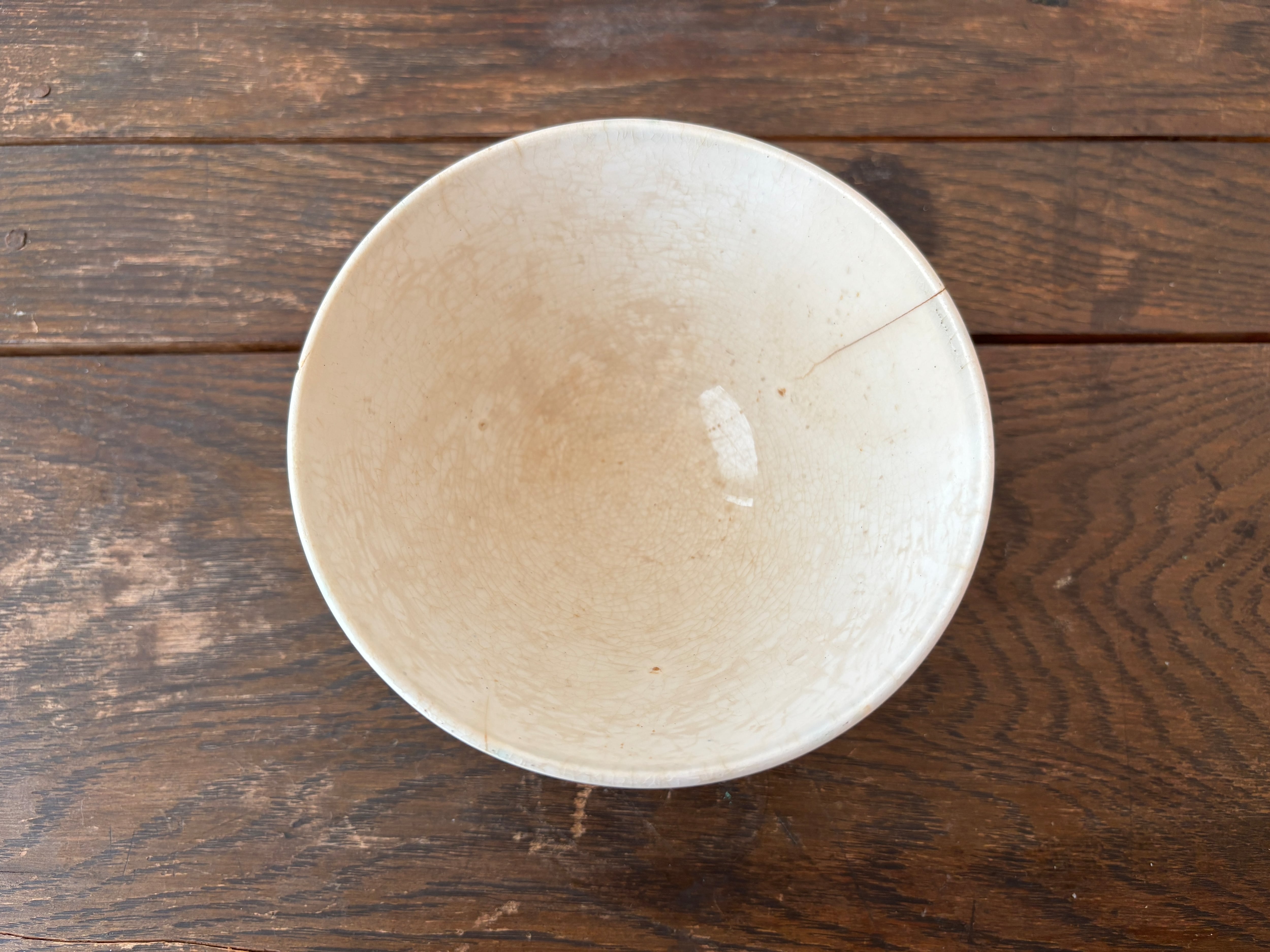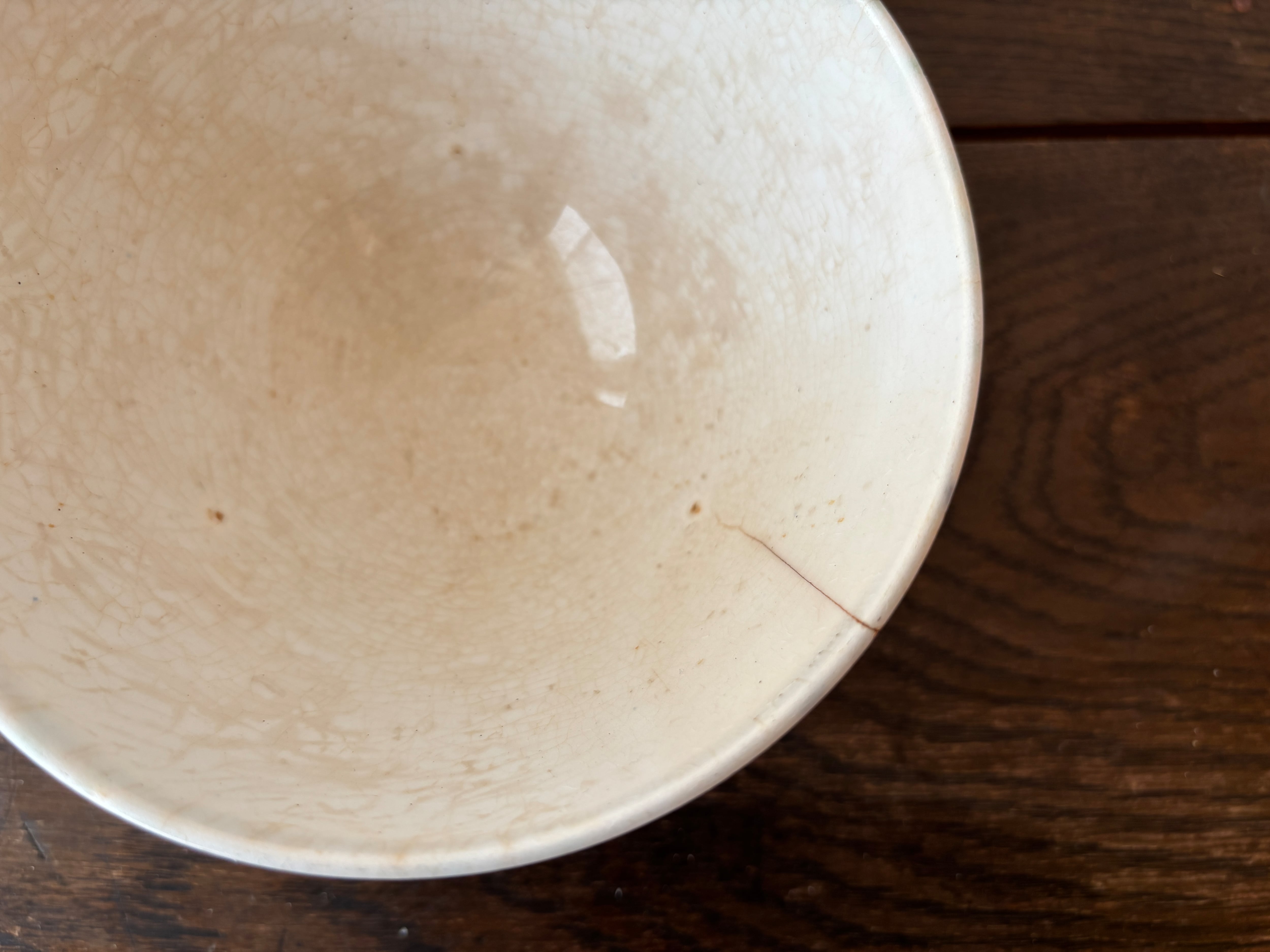 こちらのカフェオレボウルは、現地でも最も多く見られる“たっぷりサイズ”のカフェオレボウルです。外側・内側ともに不規則に入った貫入と、柔らかな色づきが美しく、雰囲気たっぷりの一品。