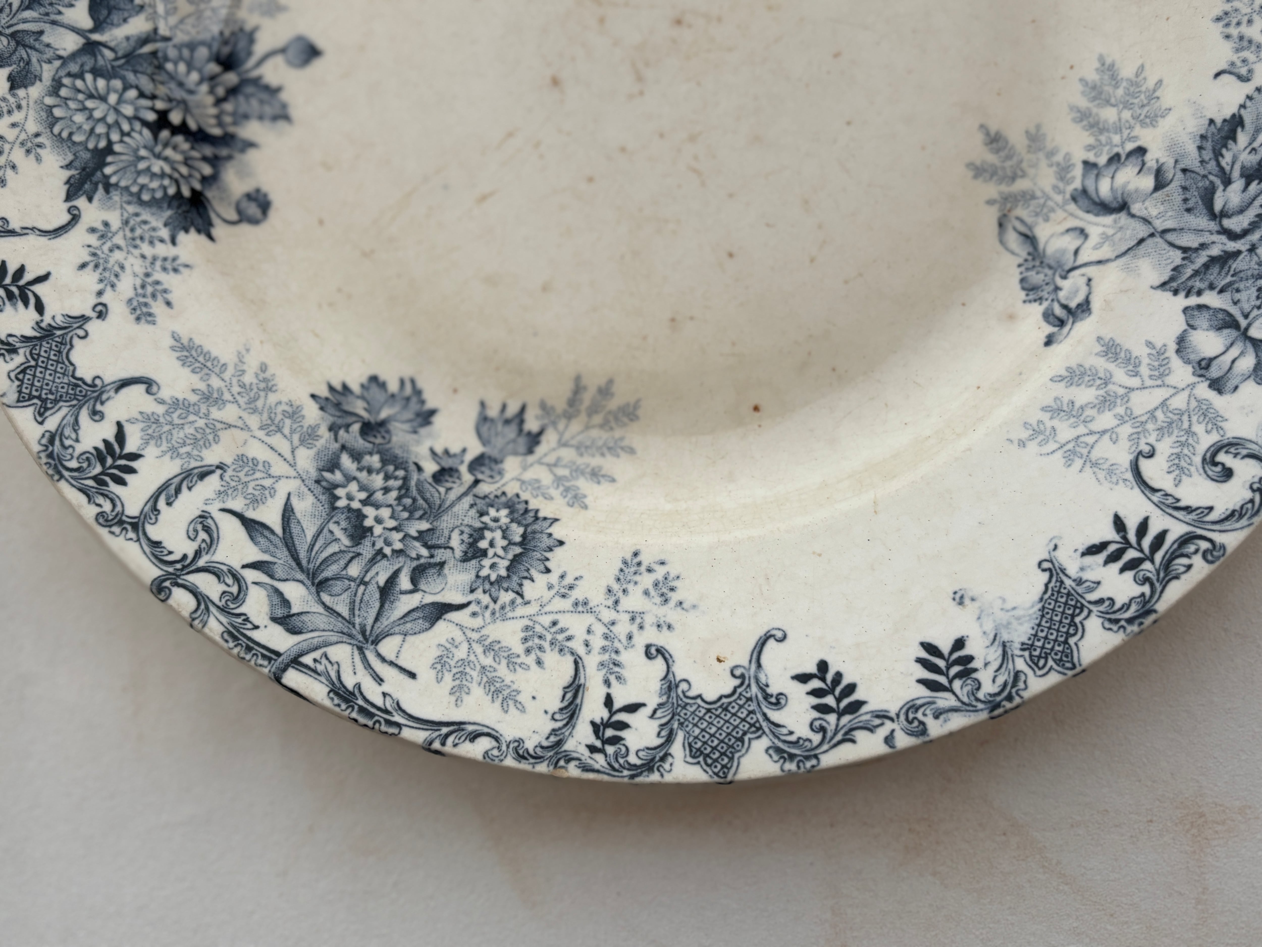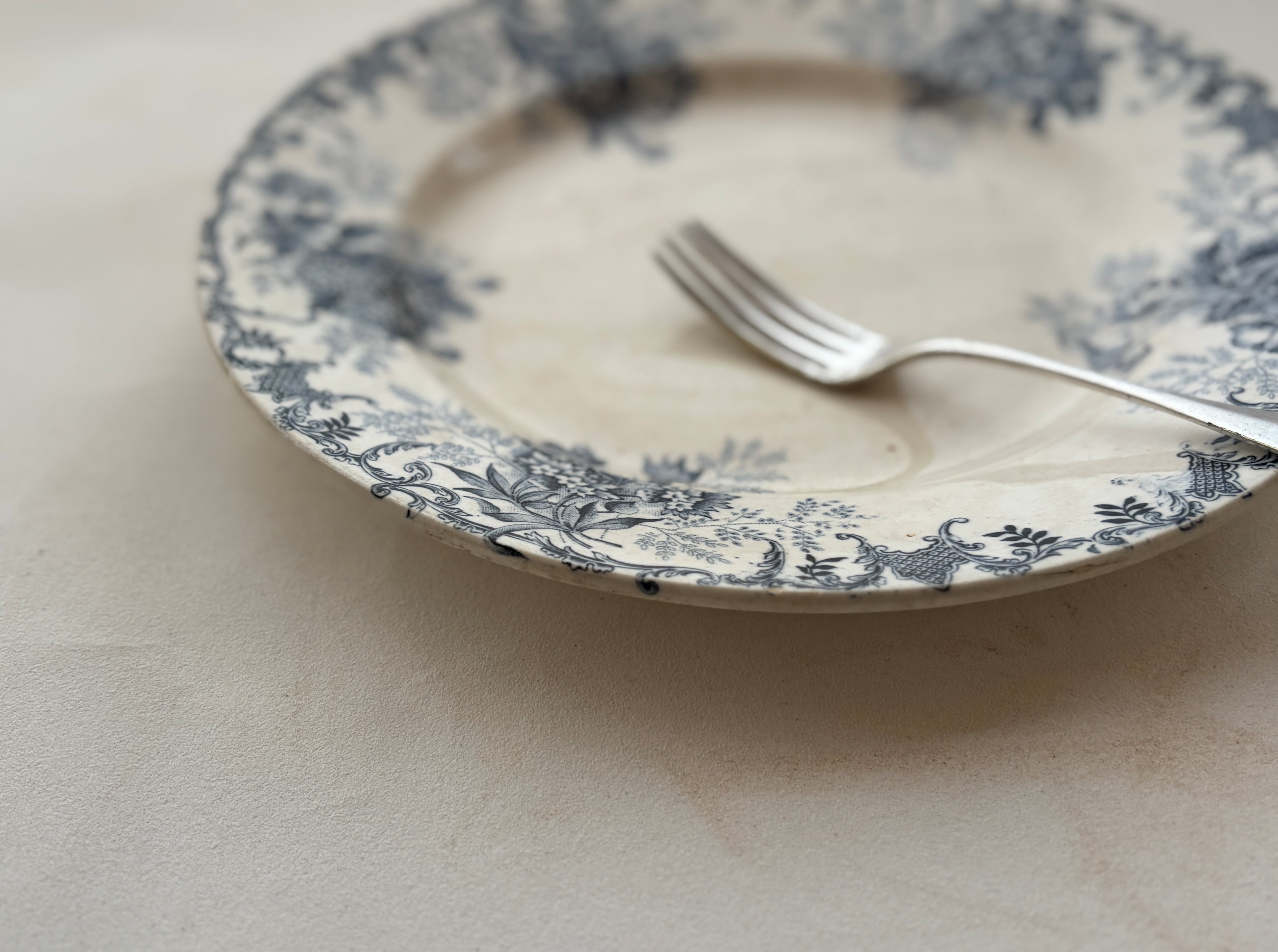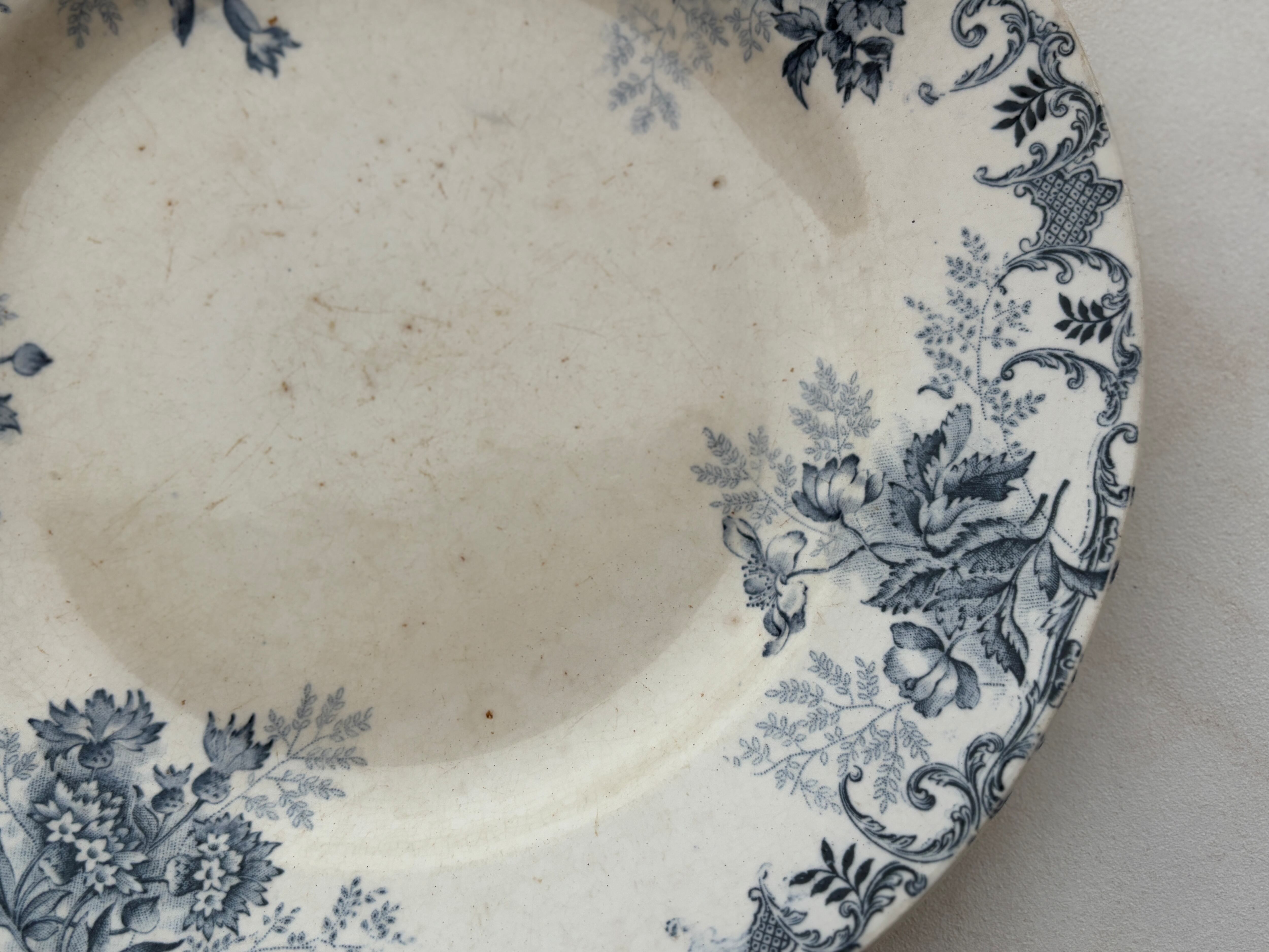 温かみのあるクリーム色の皿地に、藍色の濃淡で5箇所に花々が描かれており、140年を超えた経年変化が感じられる雰囲気のあるプレートです。