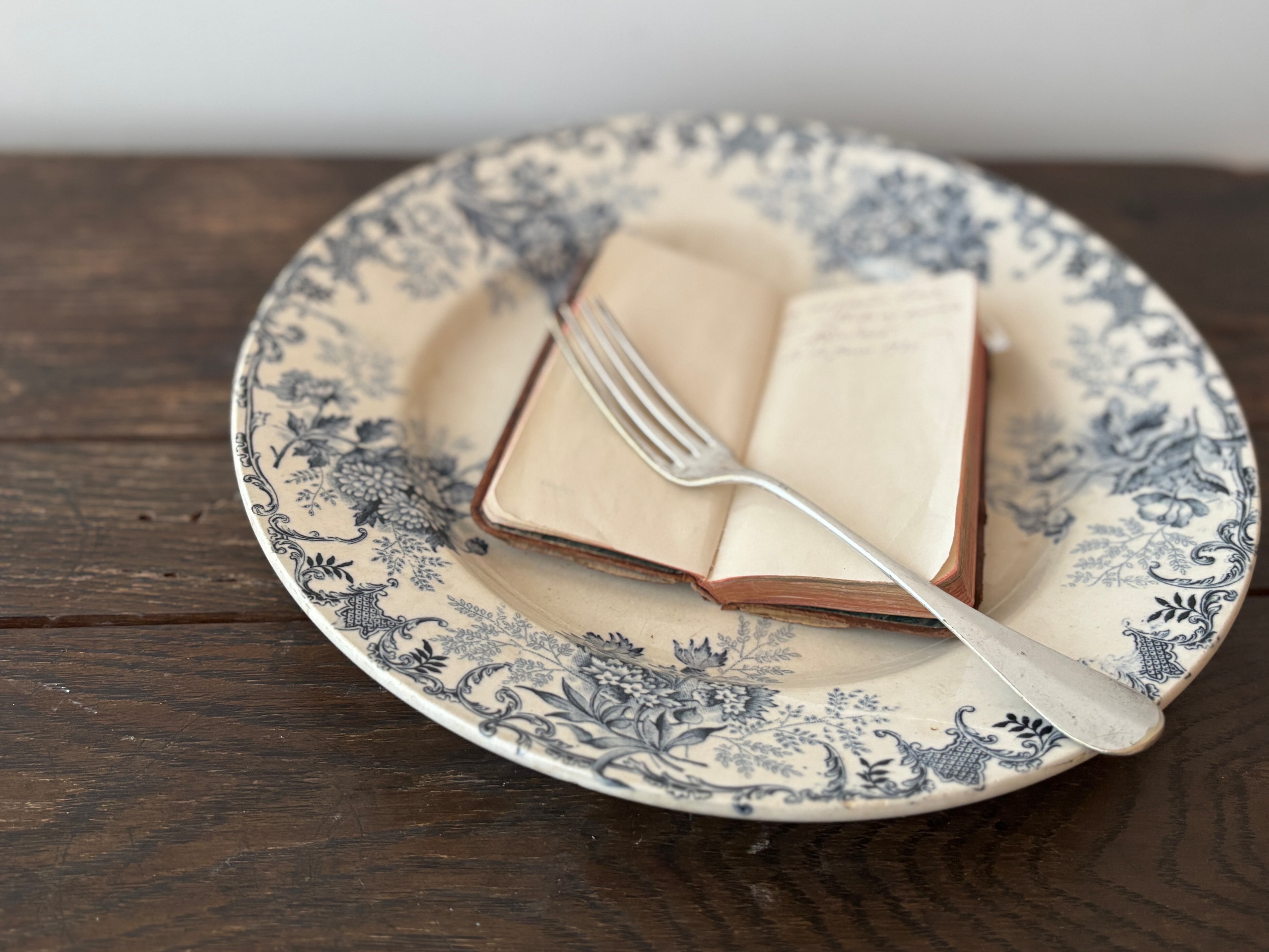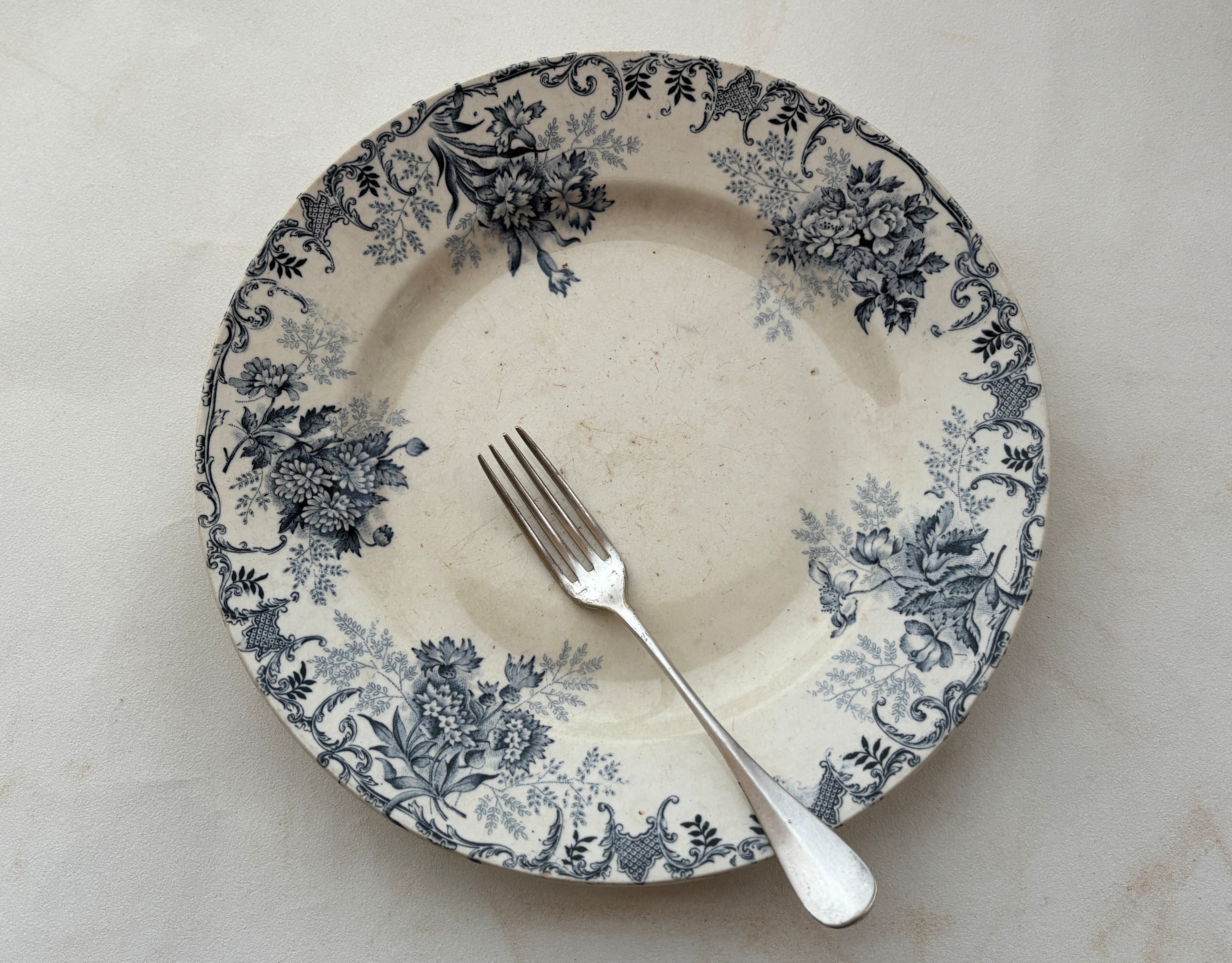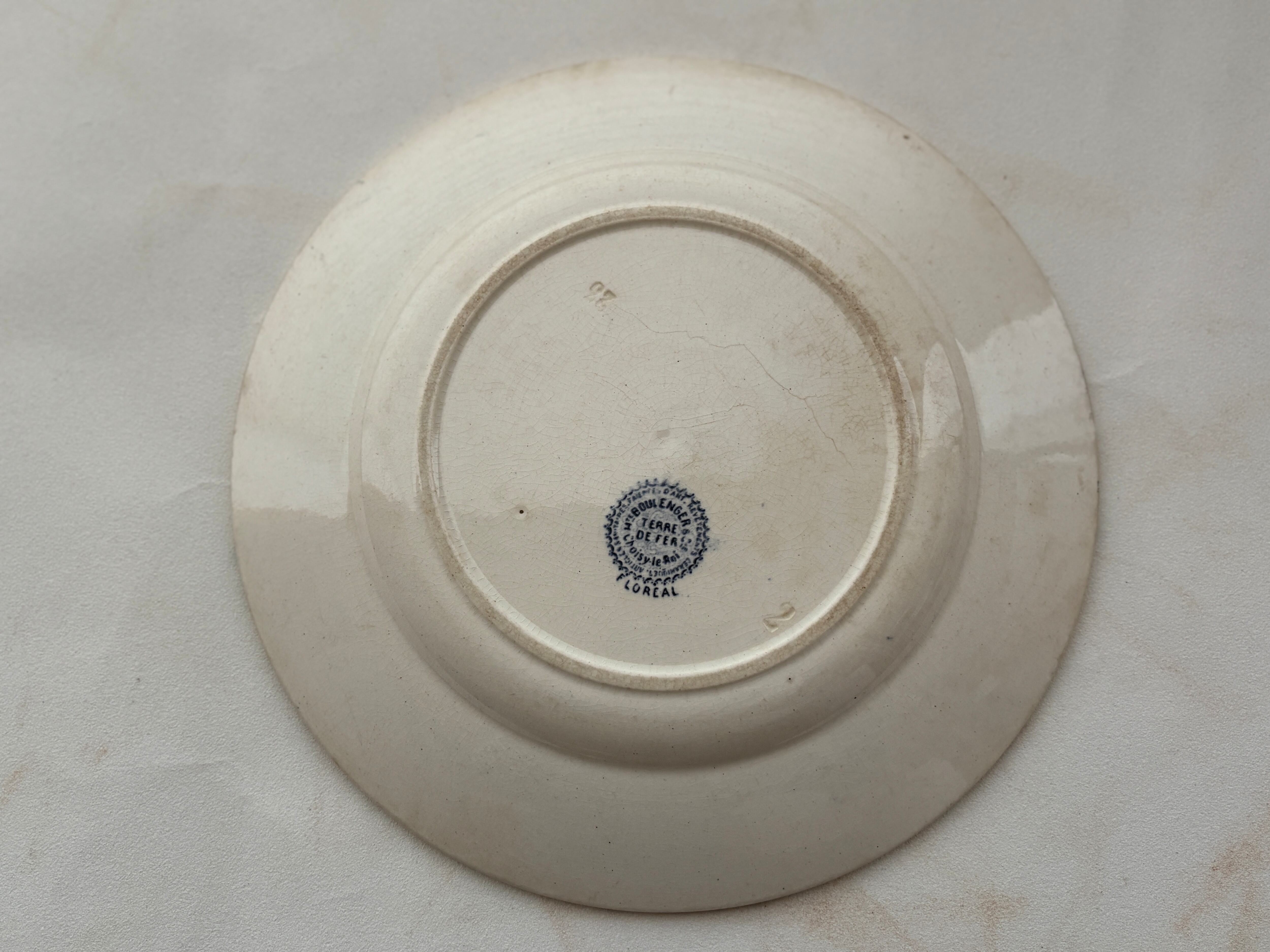 温かみのあるクリーム色の皿地に、藍色の濃淡で5箇所に花々が描かれており、140年を超えた経年変化が感じられる雰囲気のあるプレートです。