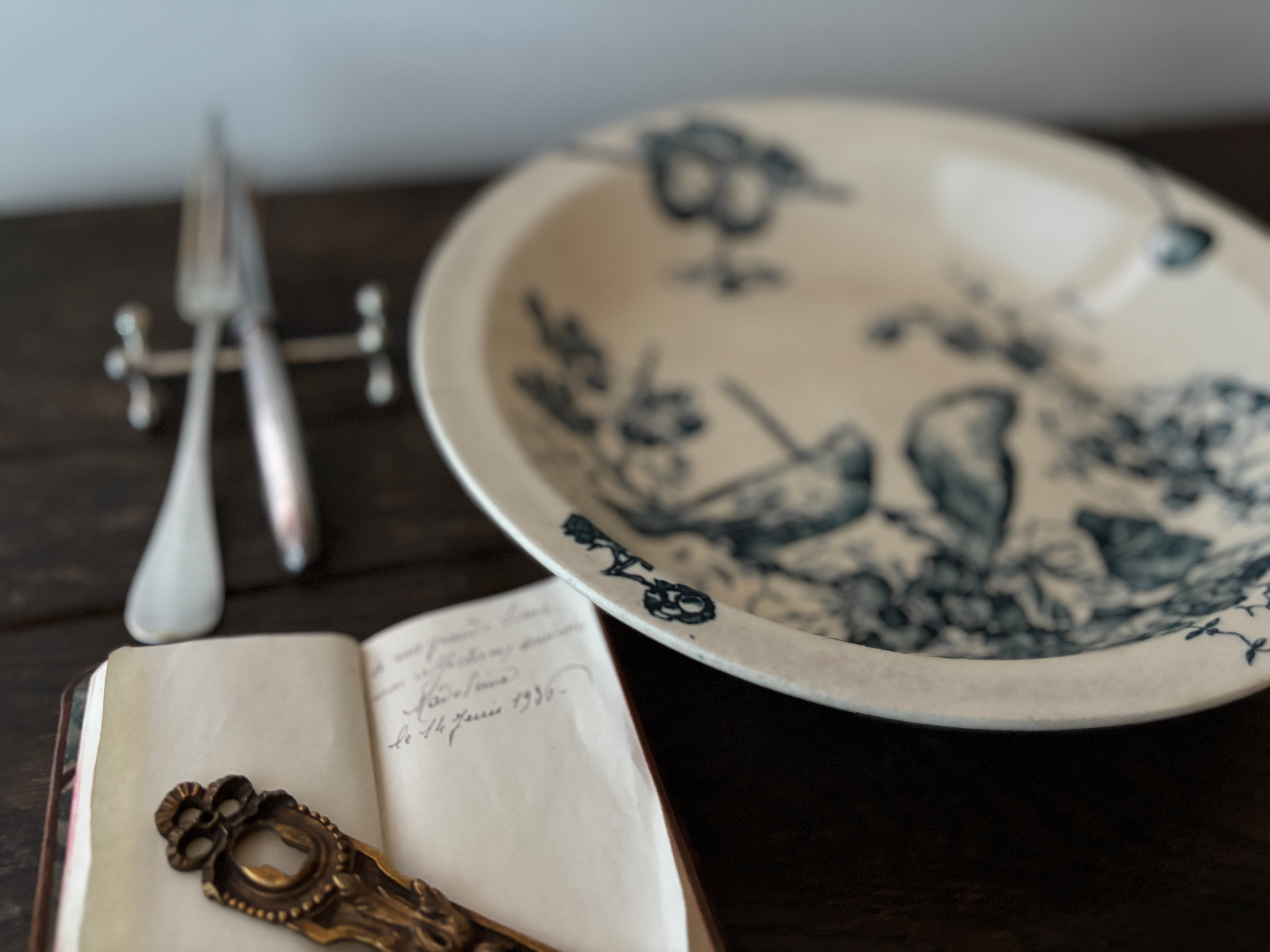 コマドリと木の実が描かれた幸せなサラダディエ。