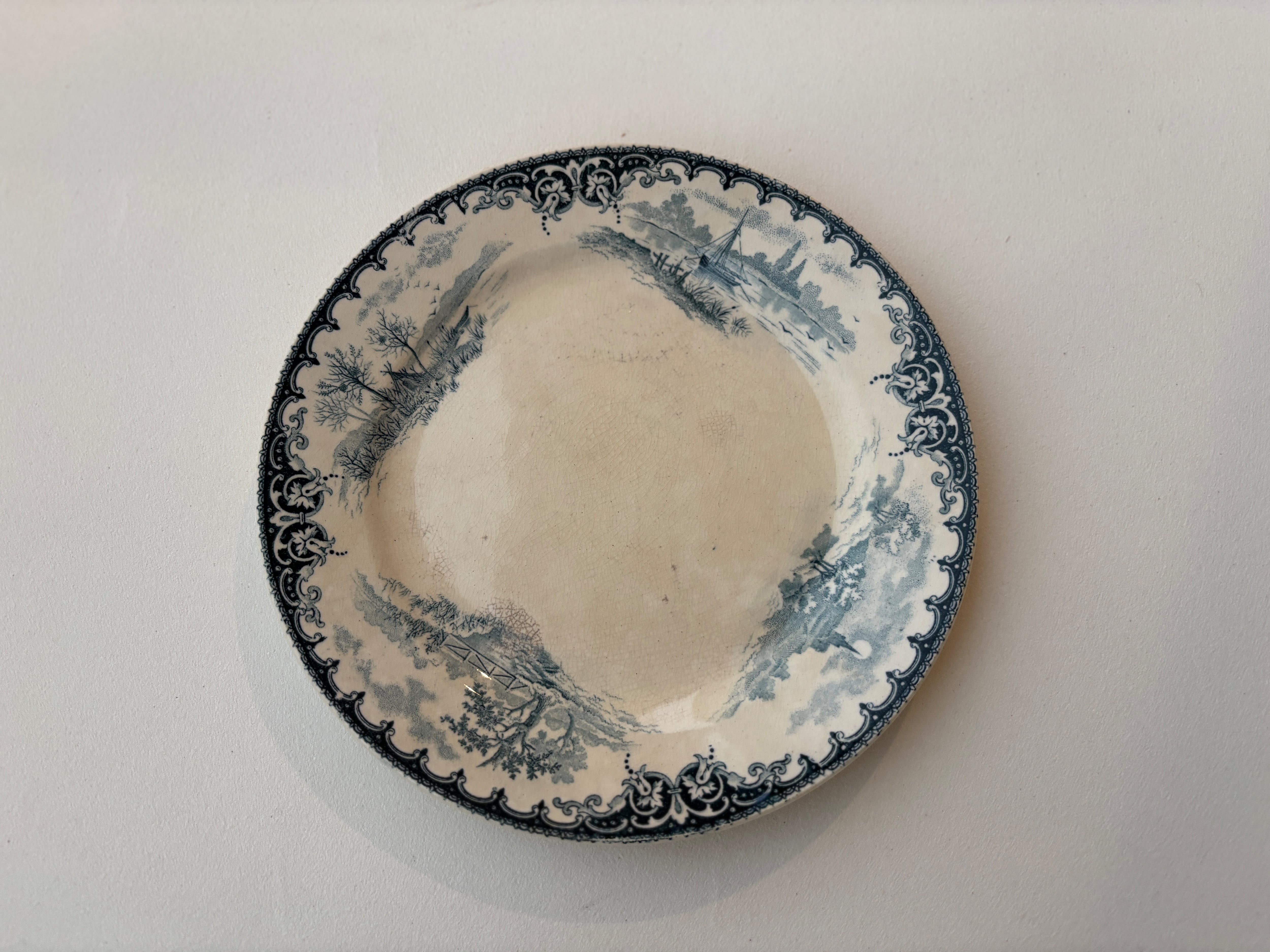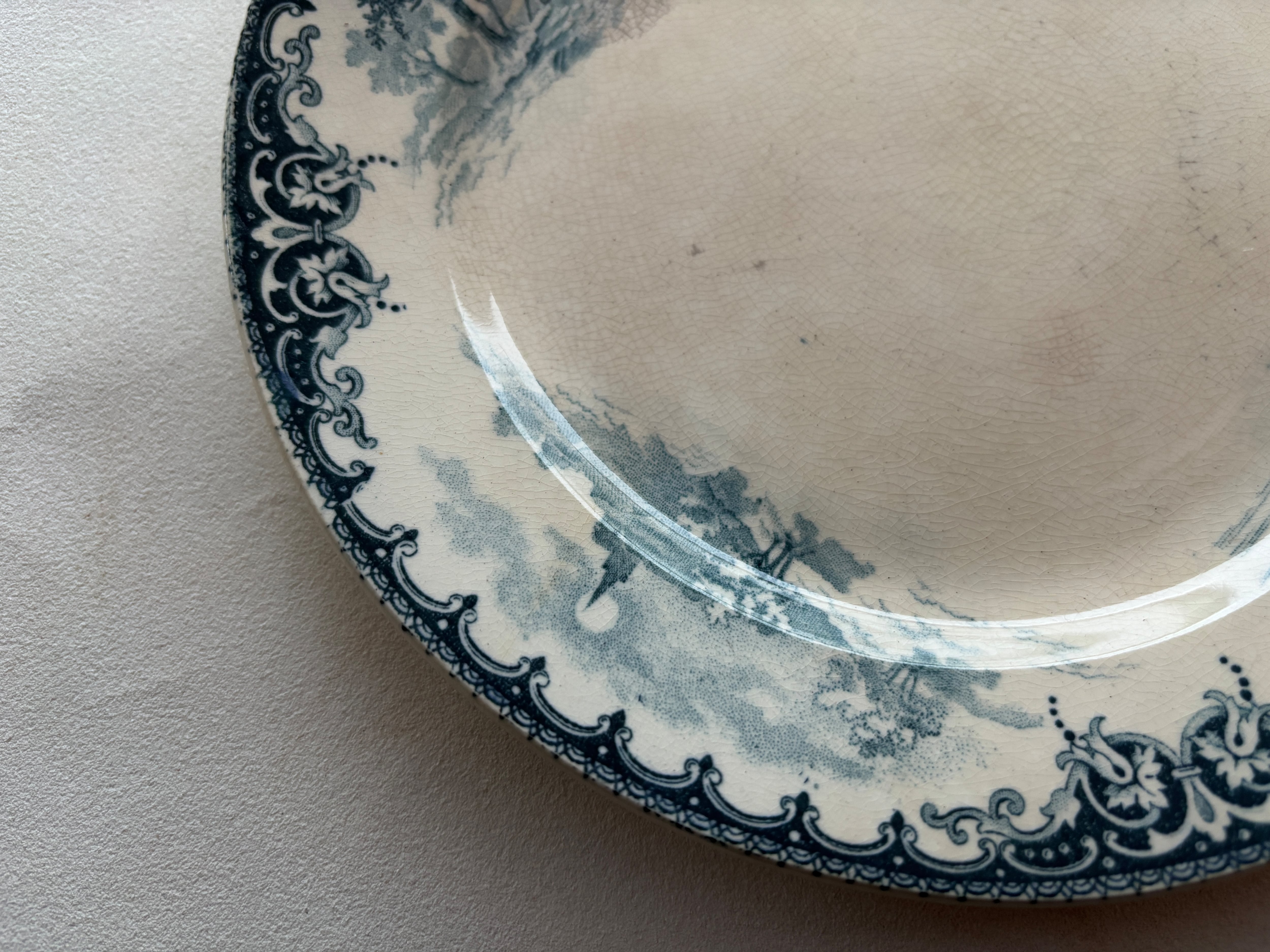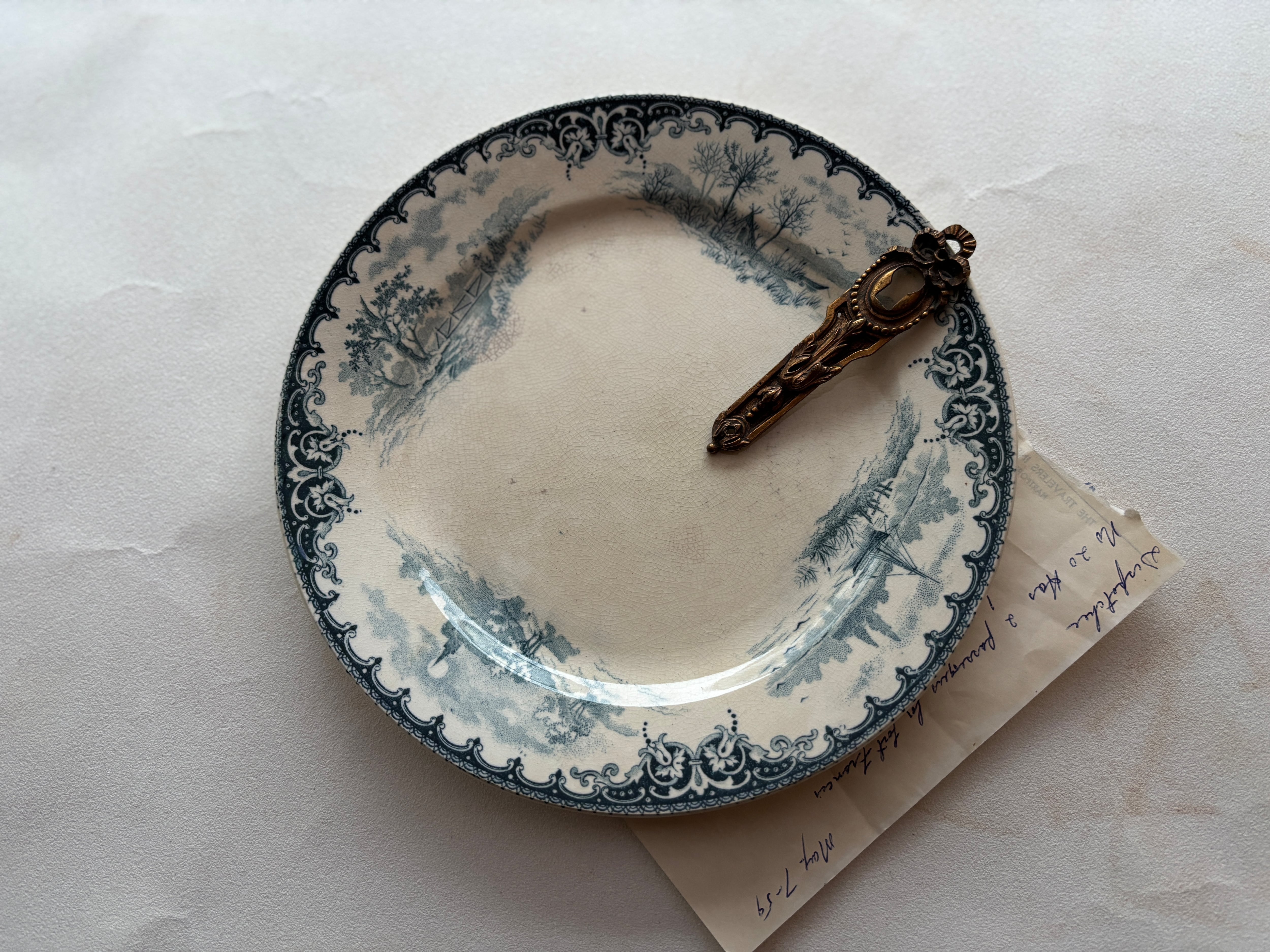 深みのあるブルーの風景柄と、繊細なリム装飾が印象的なデザートプレート。