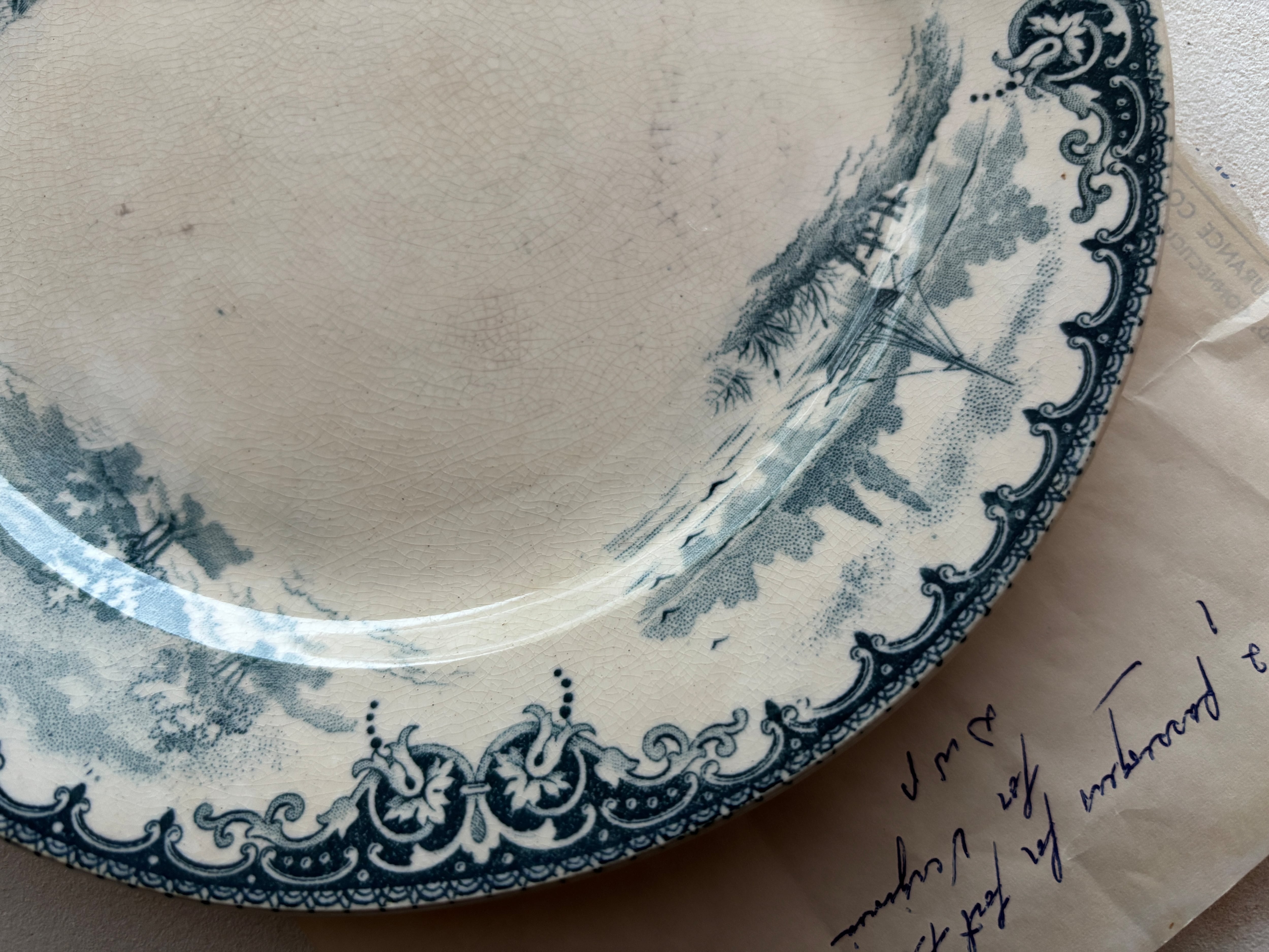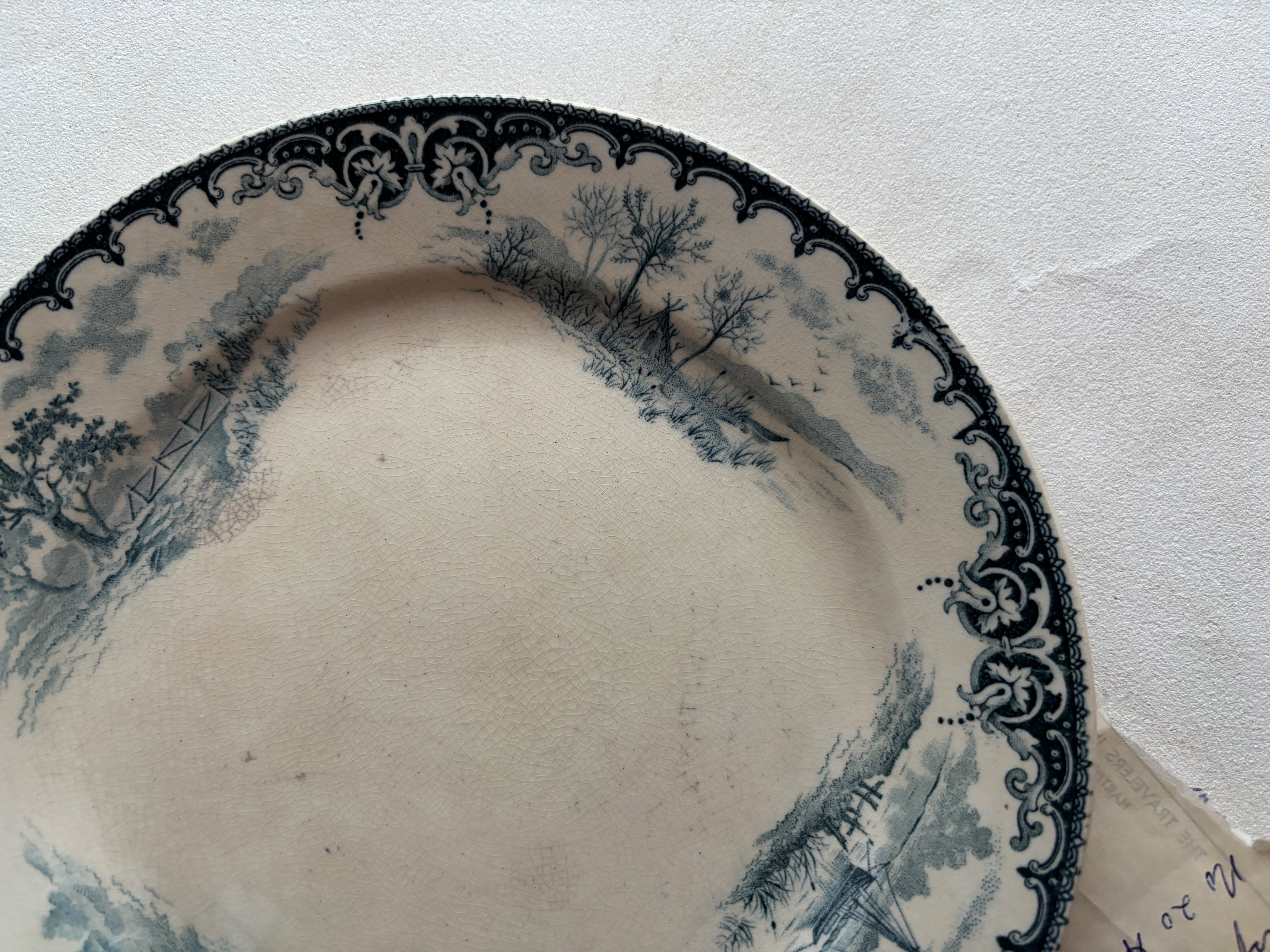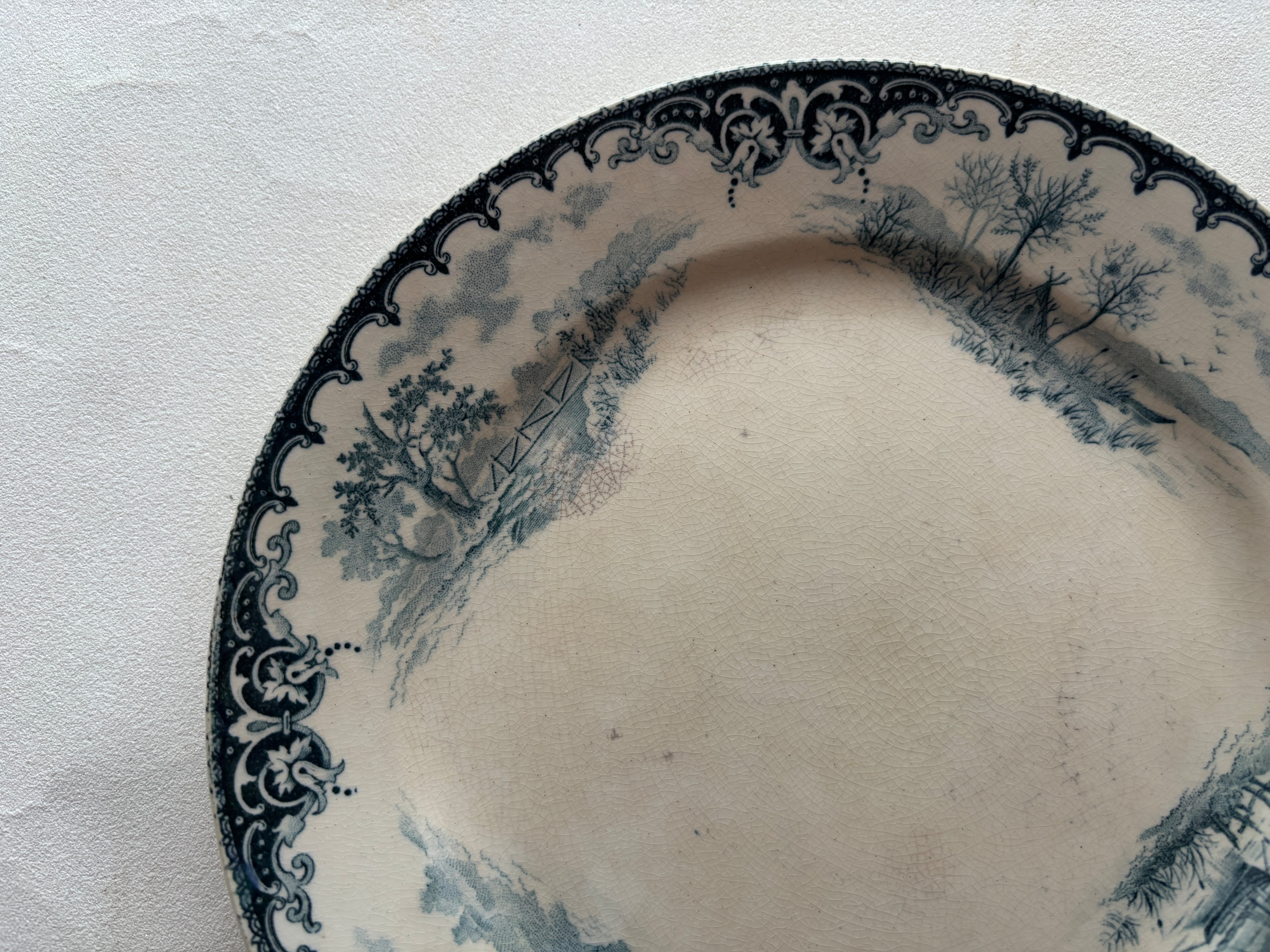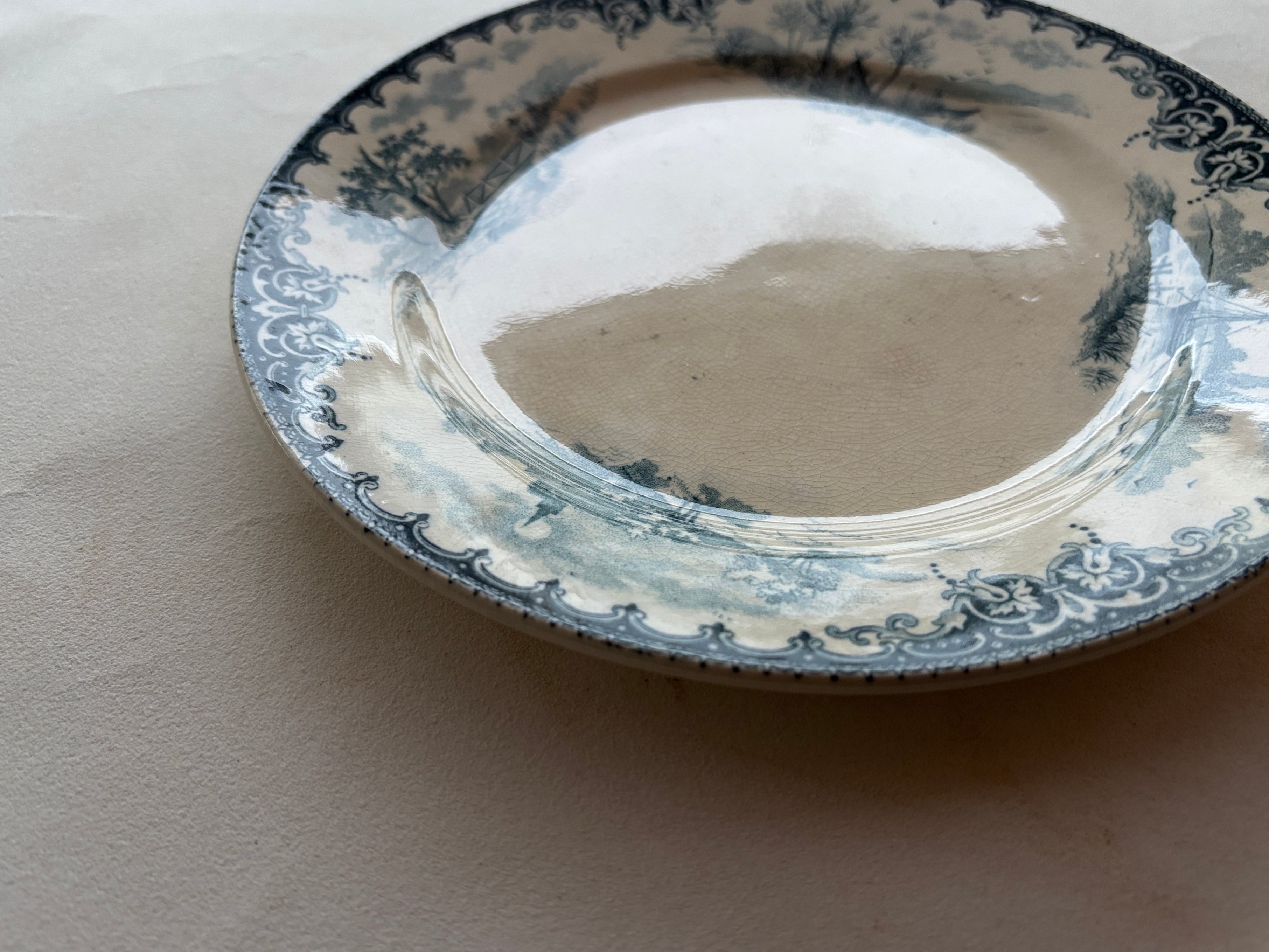 深みのあるブルーの風景柄と、繊細なリム装飾が印象的なデザートプレート。