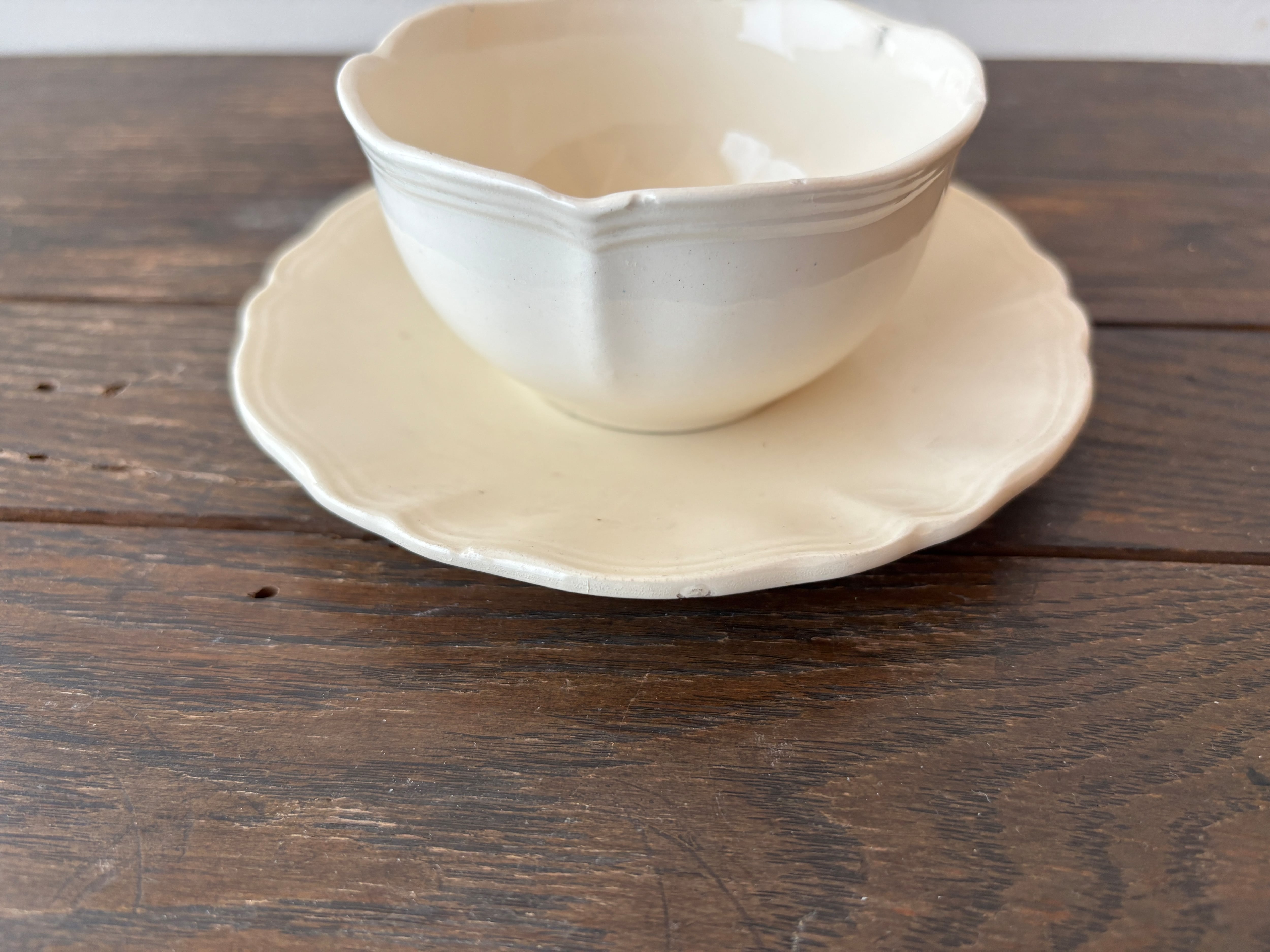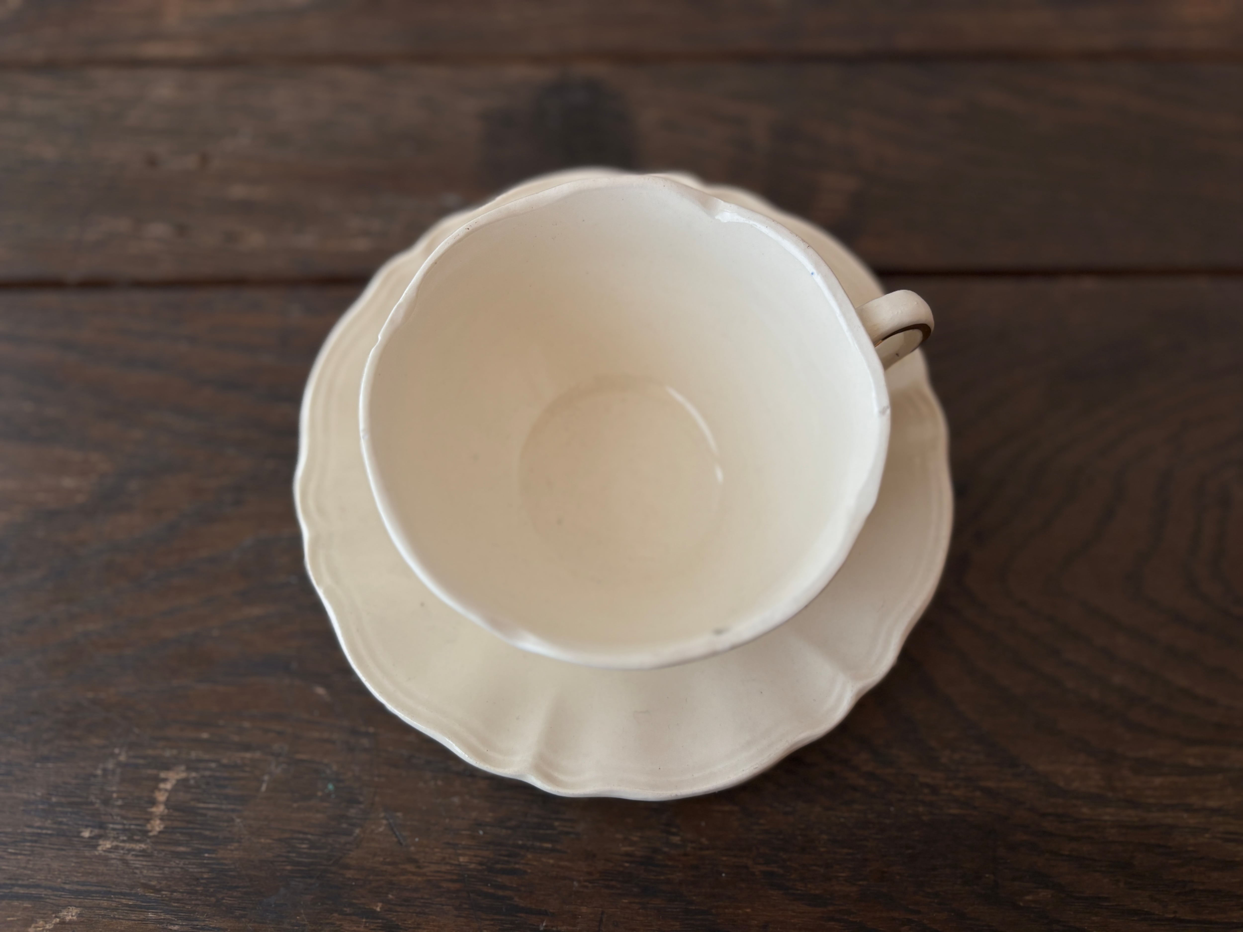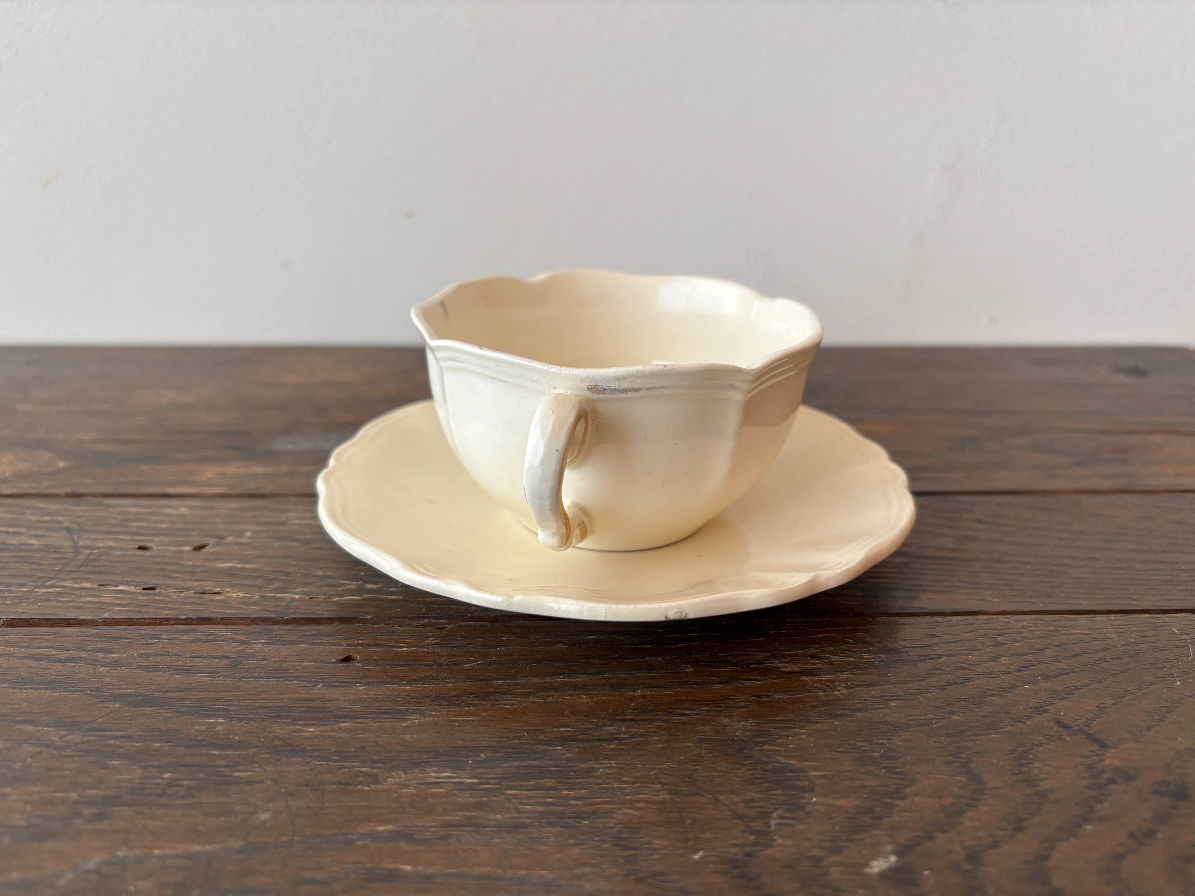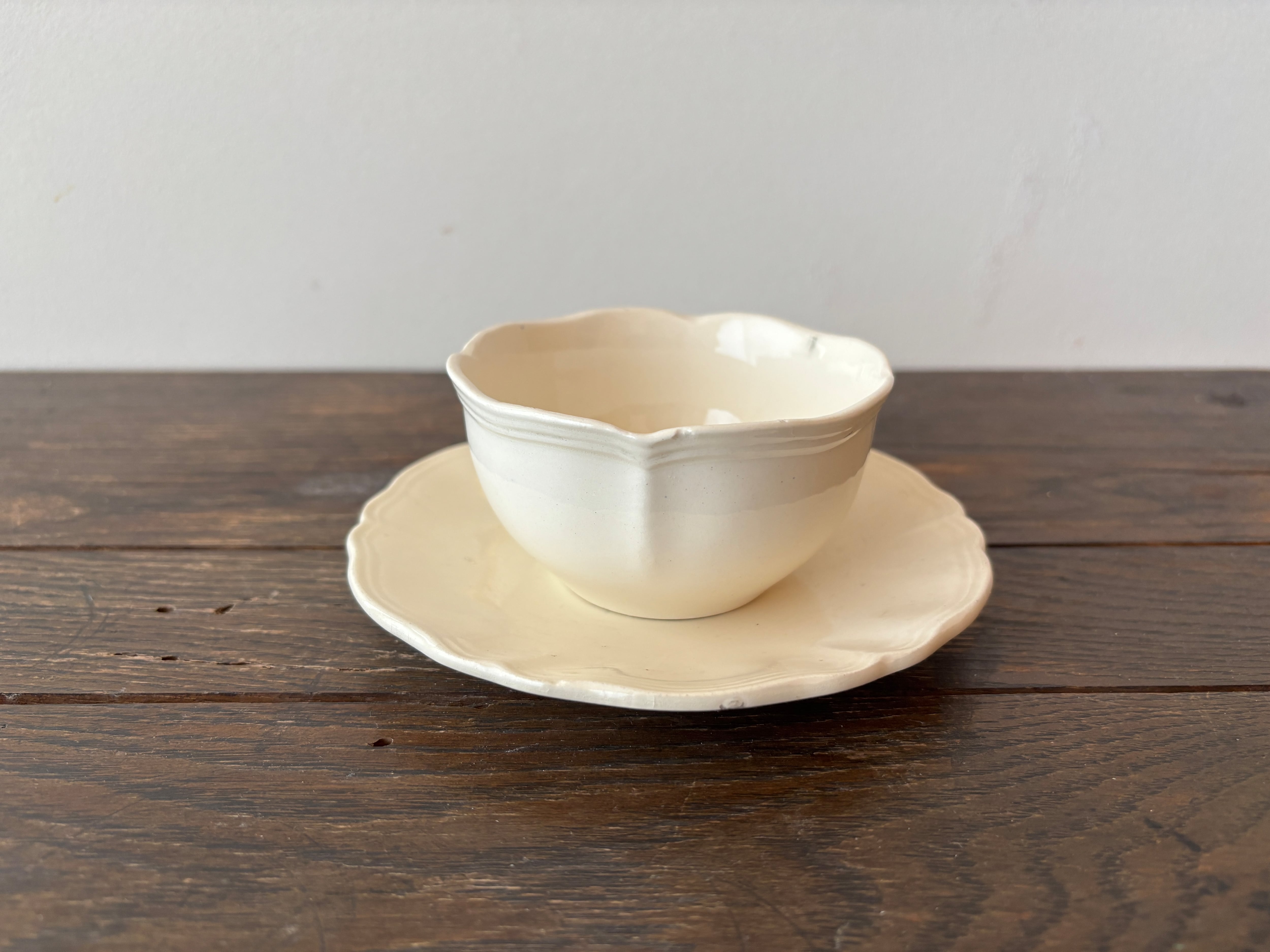 柔らかいクリーム色と口縁の花リムのフォルムも素敵でとても癒されます。