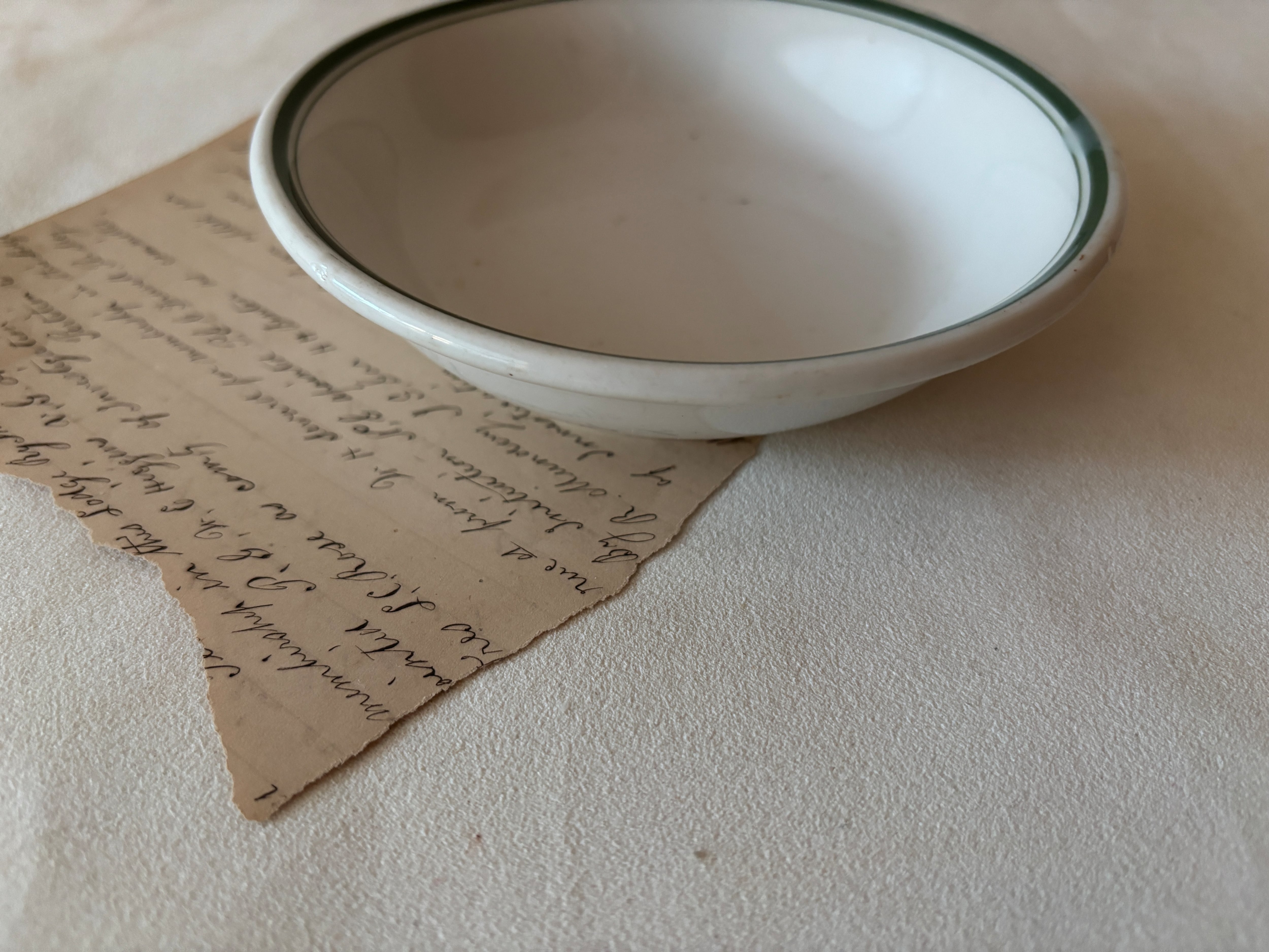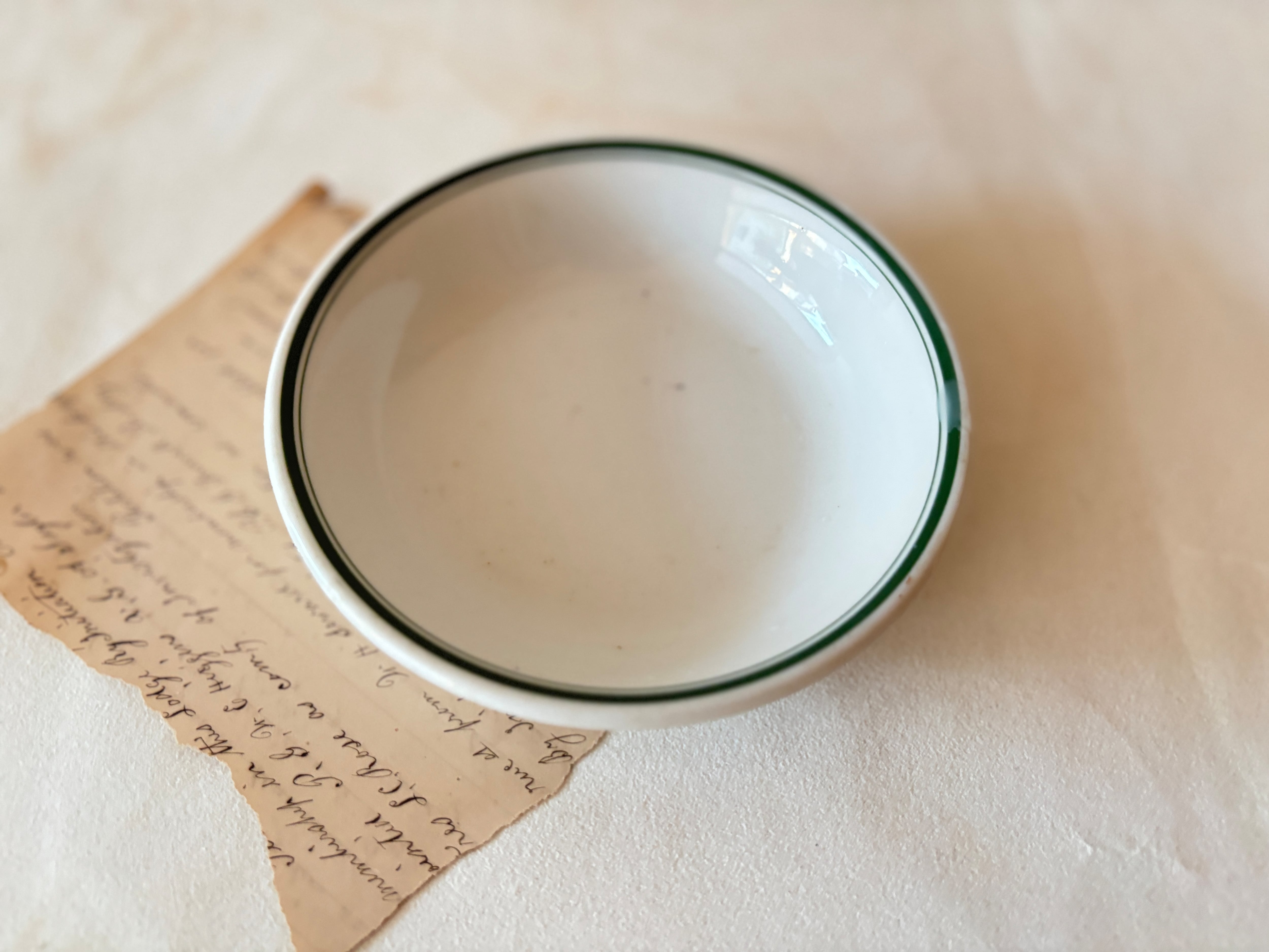 1900年〜1920年頃に製造されたと思われる本品は、白磁ならではのしっとりとした艶やかな陶肌が特徴。縁に施された深いグリーンの細ラインが、アイボリーの優しさをキリッと引き締め、凛とした表情を作り出しています。