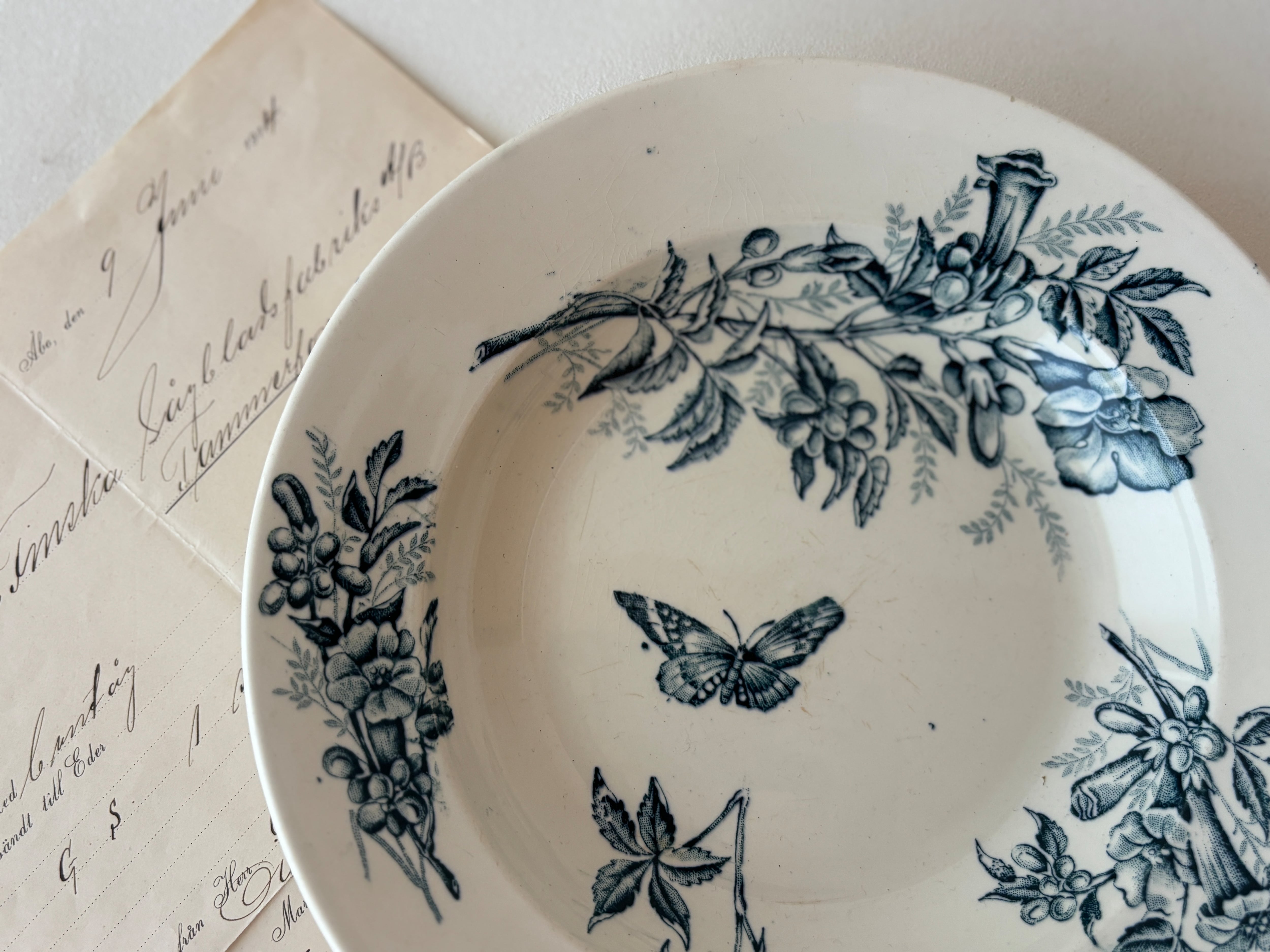 流れるような花束の傍らで、一匹の蝶が可憐に舞う姿が器全体を彩り、まるで静かな庭園のひとときを切り取ったかのような物語を感じさせてくれます。
