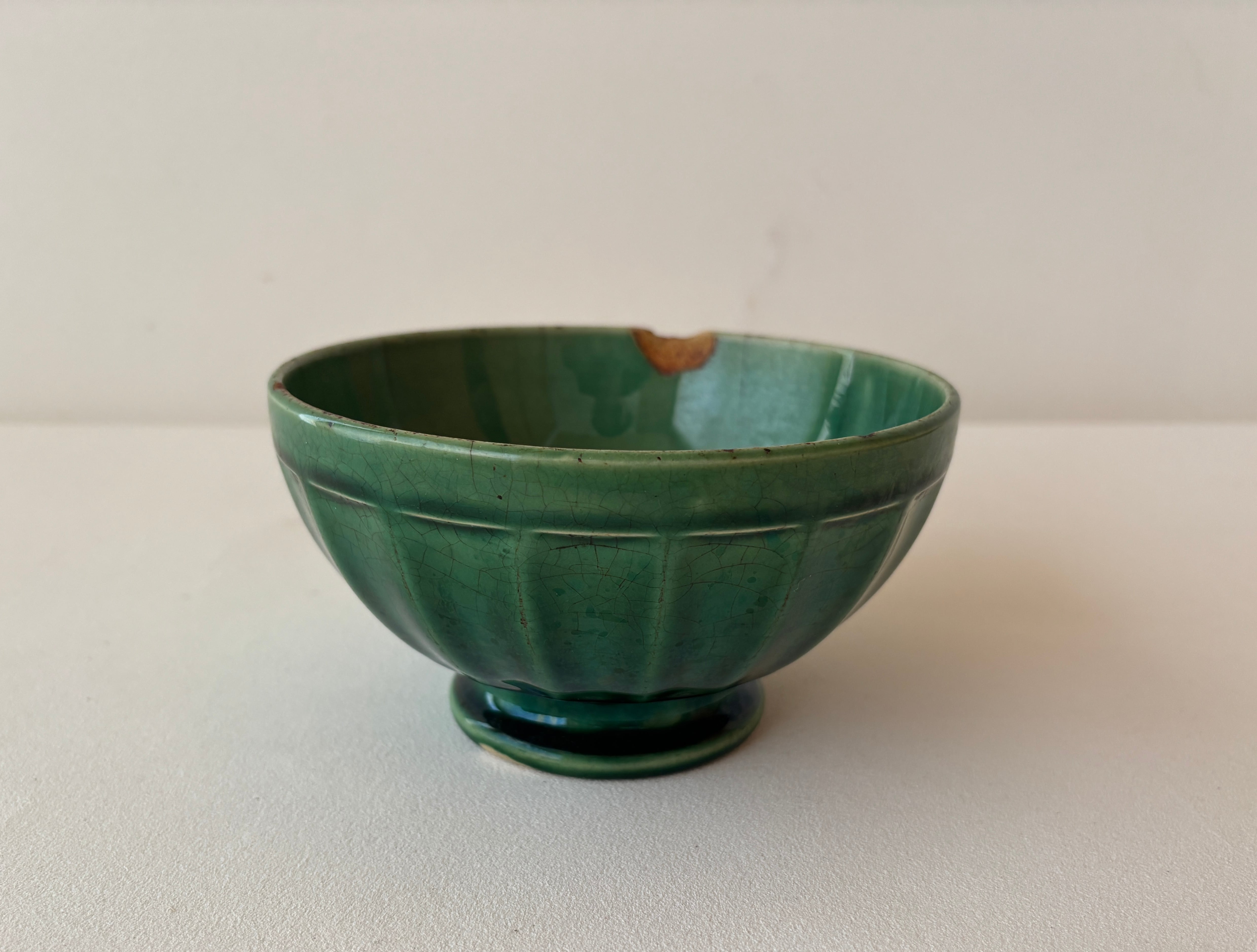 鮮やかなグリーンの釉薬が美しく、浅くて広がりのあるころんとしたフォルムが愛らしい一品です。