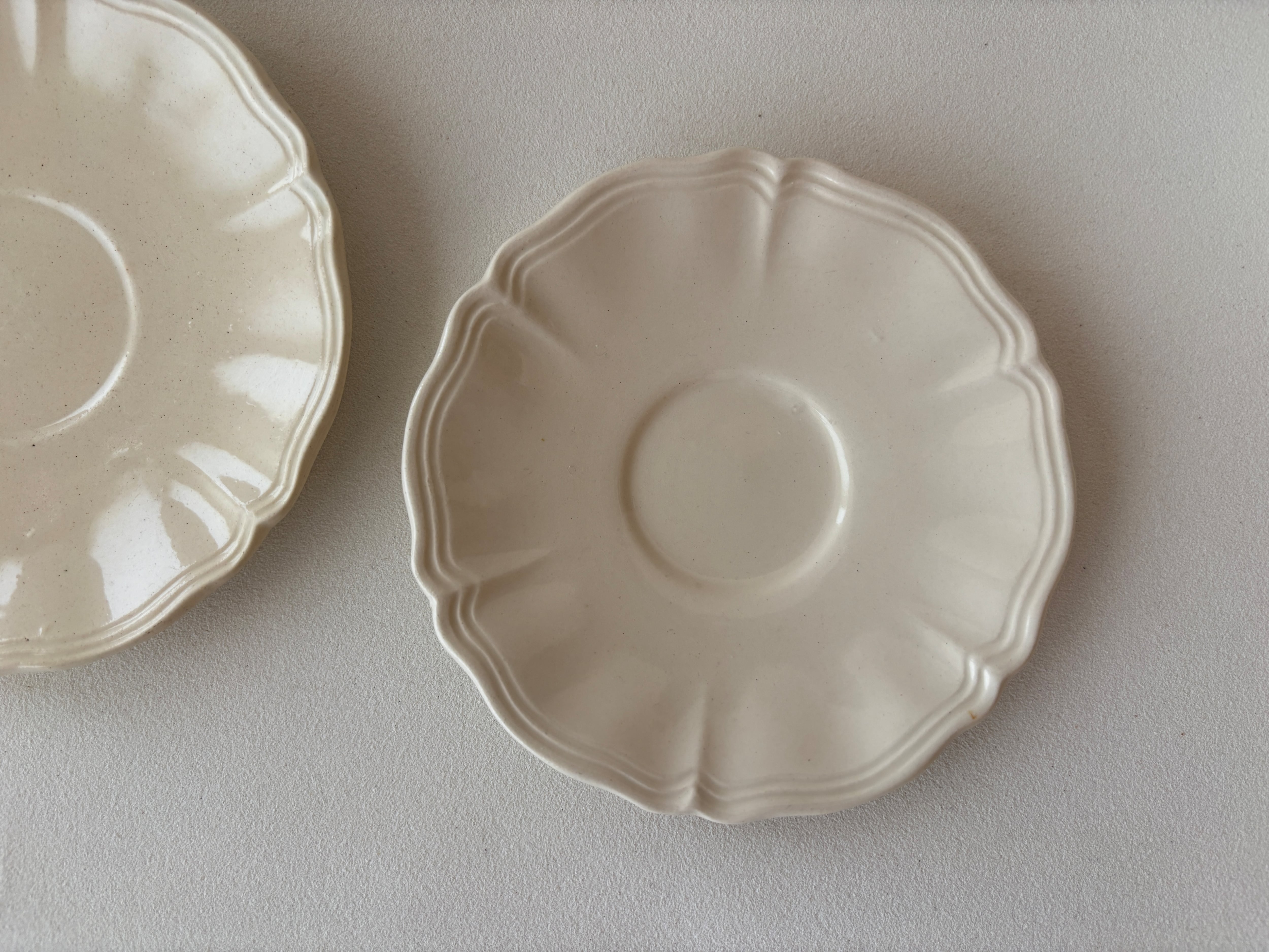 ティーカップはオフホワイトカラー、ソーサーはややアイボリーがかった色合い、デミタスのソーサーはオフホワイトカラーになります。