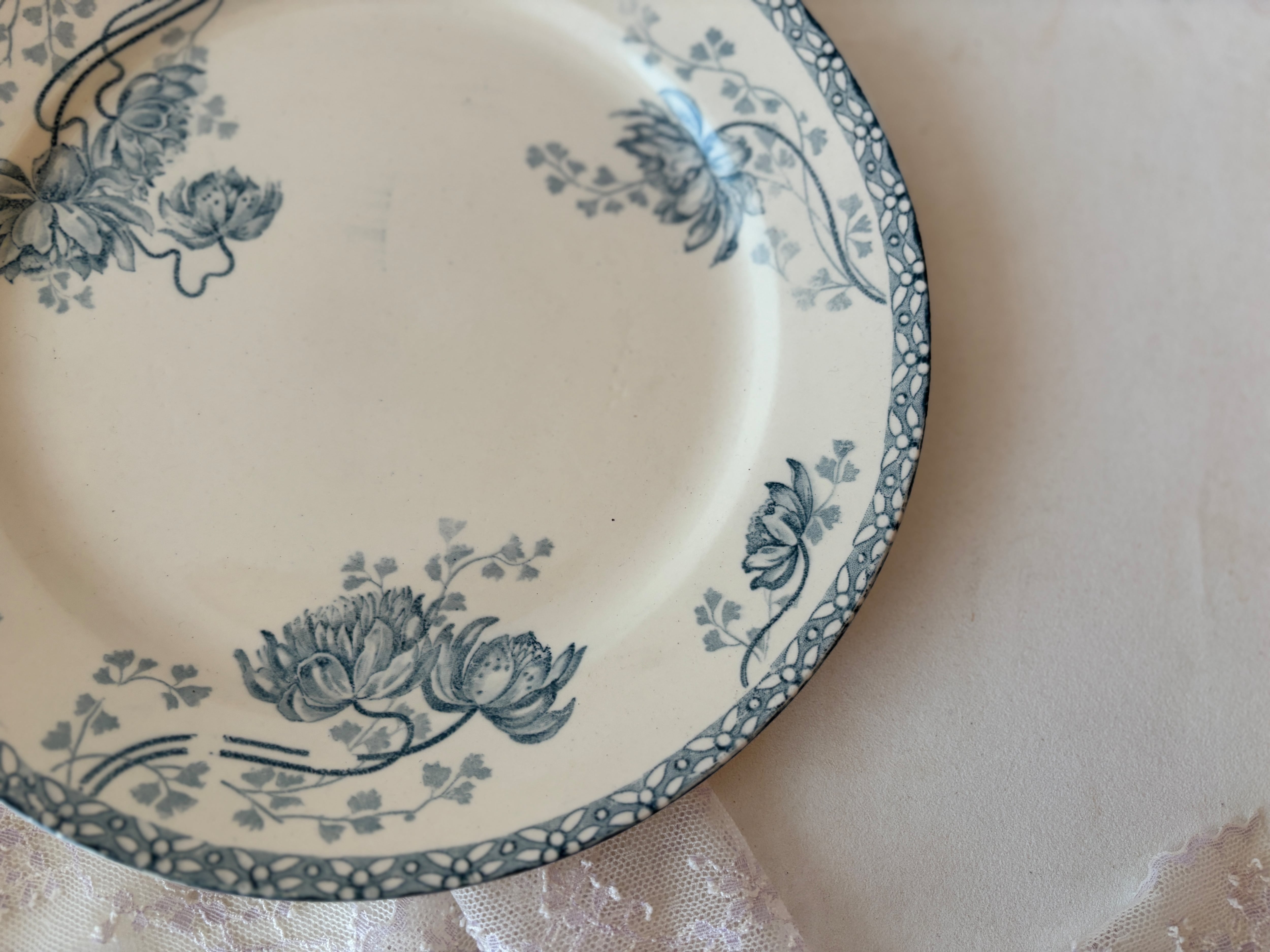 器面には、アール・ヌーヴォーの影響を感じさせるしなやかな曲線で、蓮の花が優雅に描かれています。リム(縁)を飾る格子状の文様とも相まったデザイン。