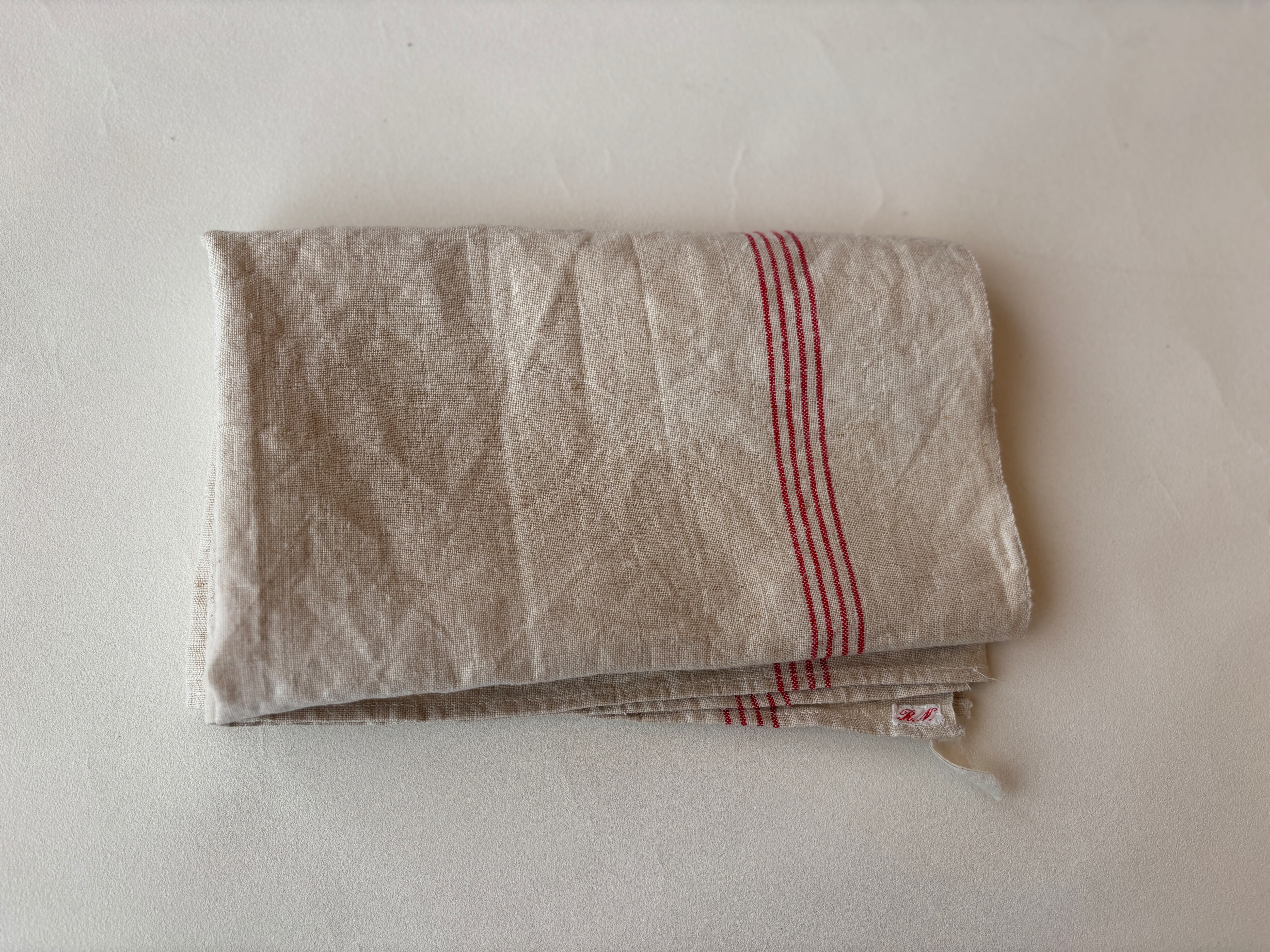 フランスアンティーク / トーション リネン キッチンクロス ベージュ×赤ライン