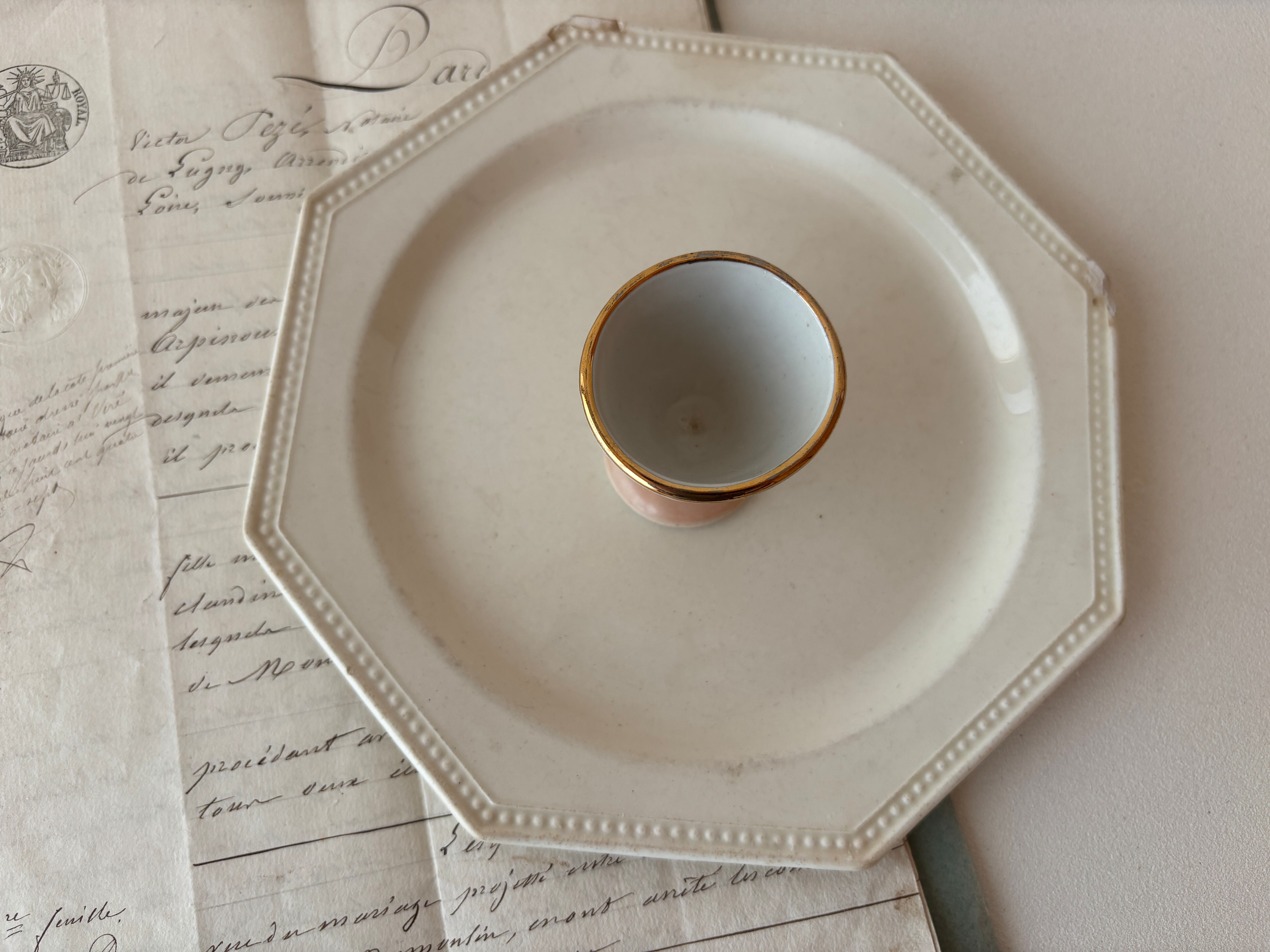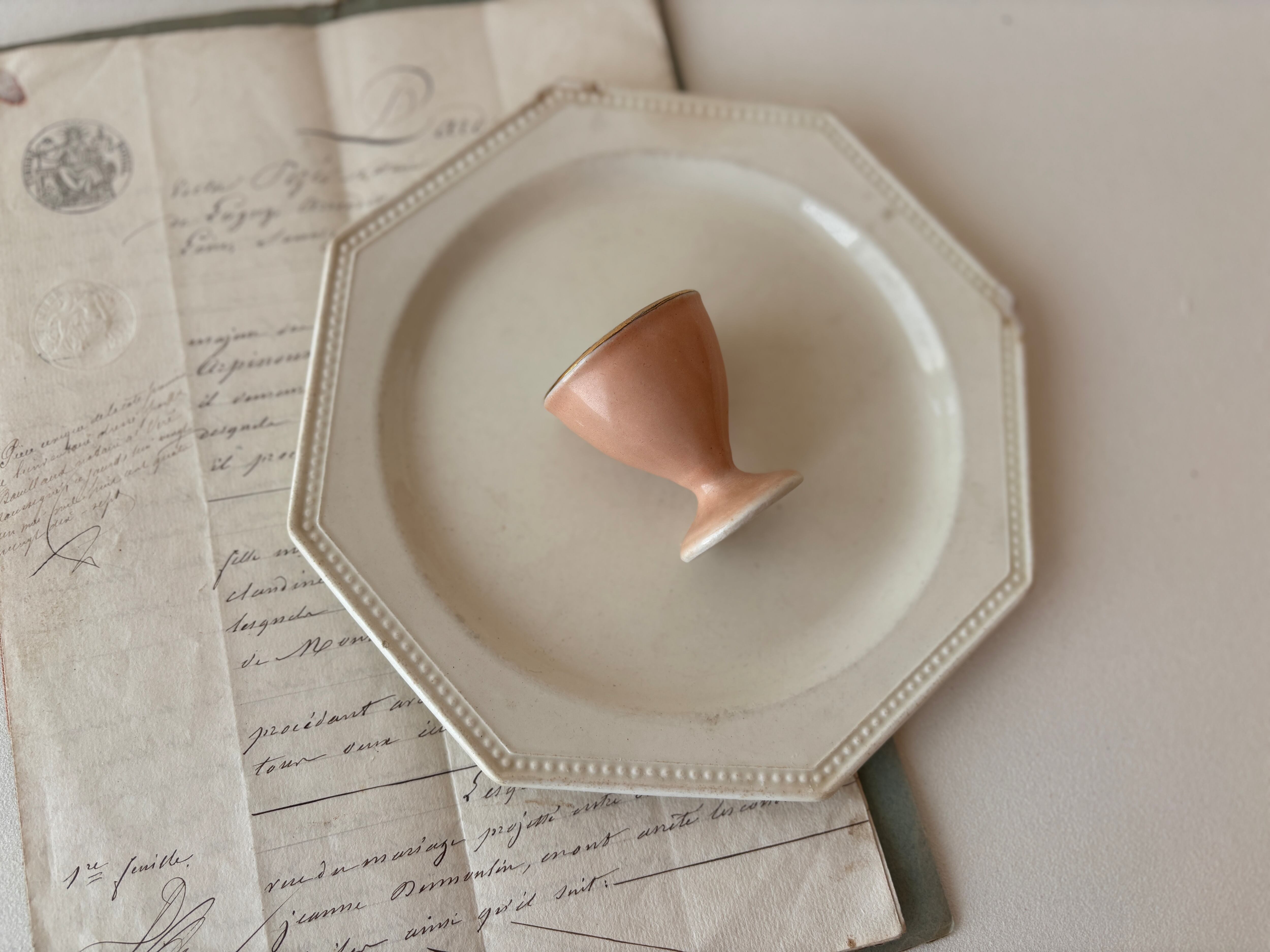 エッジに金彩の入ったペールピンクのコクティエ(エッグスタンド)が