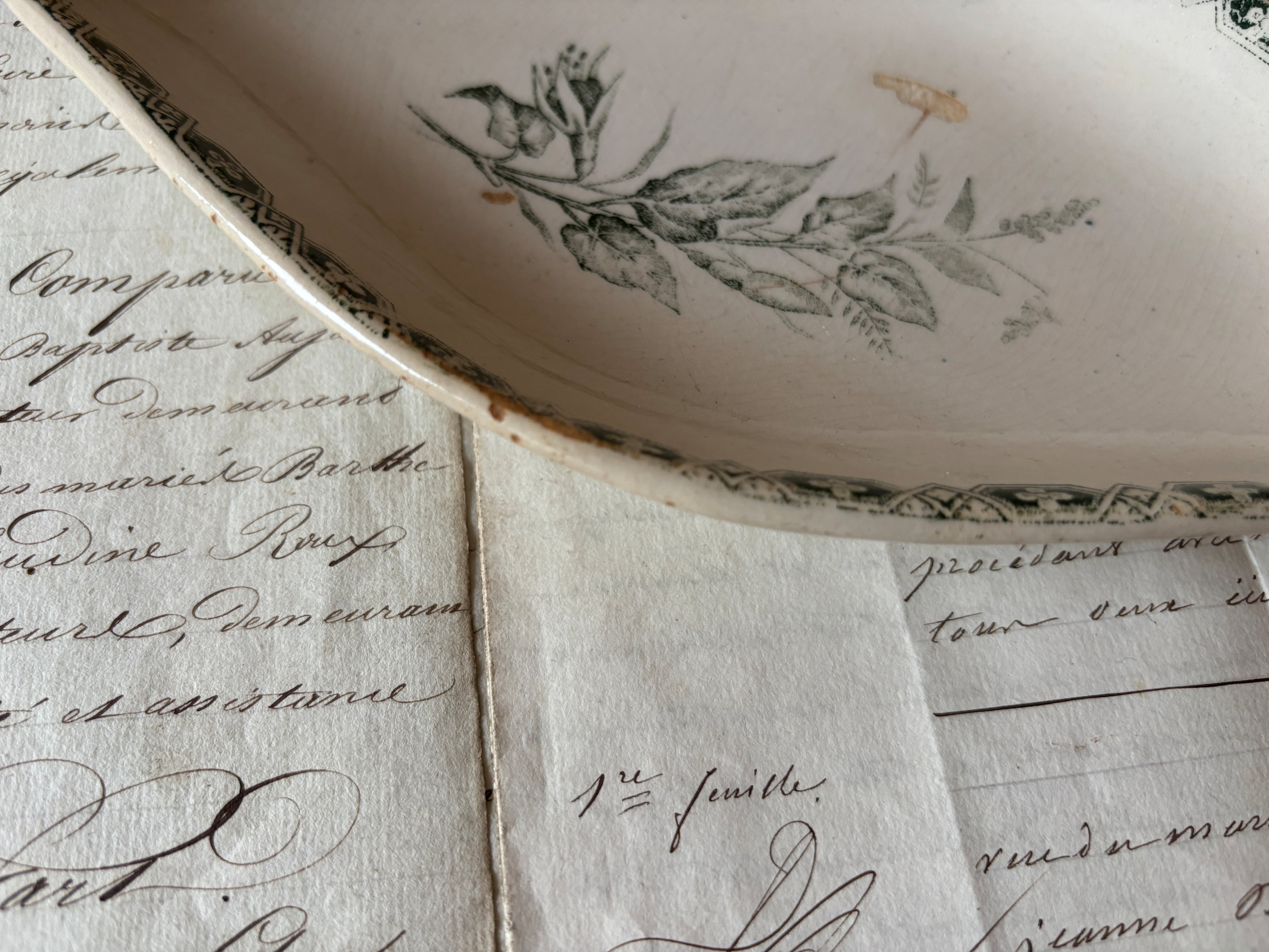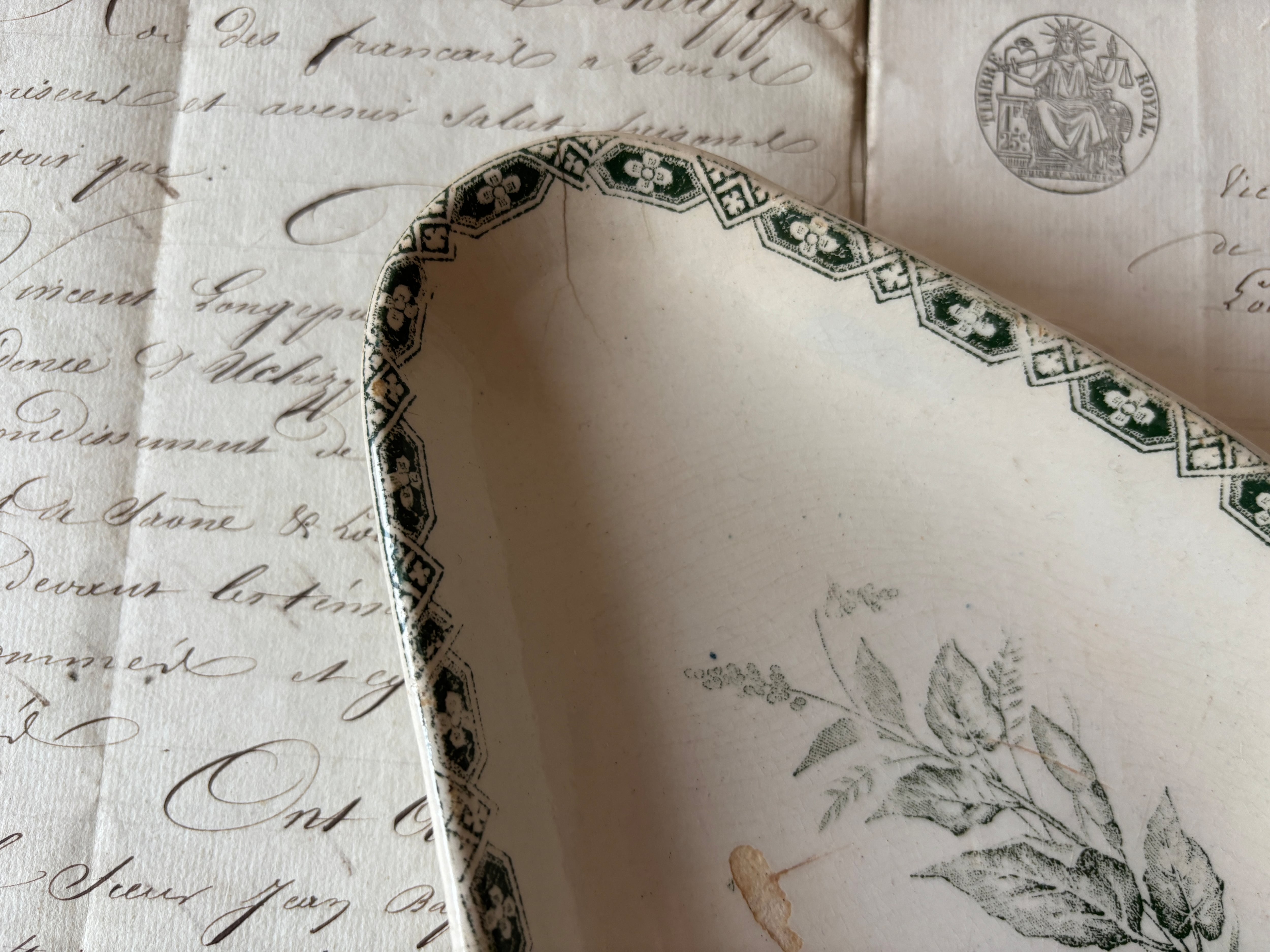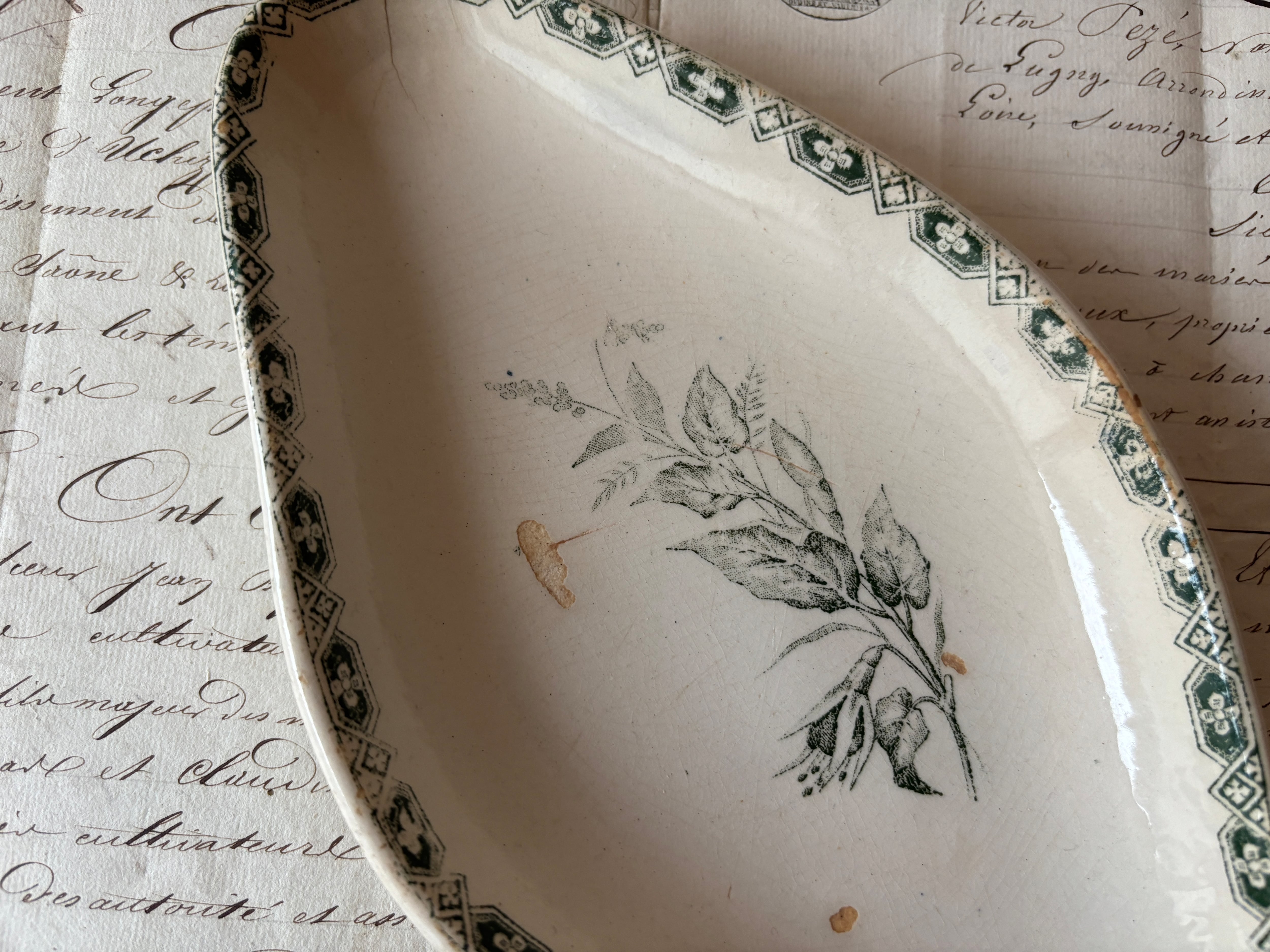 落ち着いた深いグリーンの絵柄が、艶やかなアイボリーの陶肌に映え、古いものならではの静謐な佇まいを感じさせます。