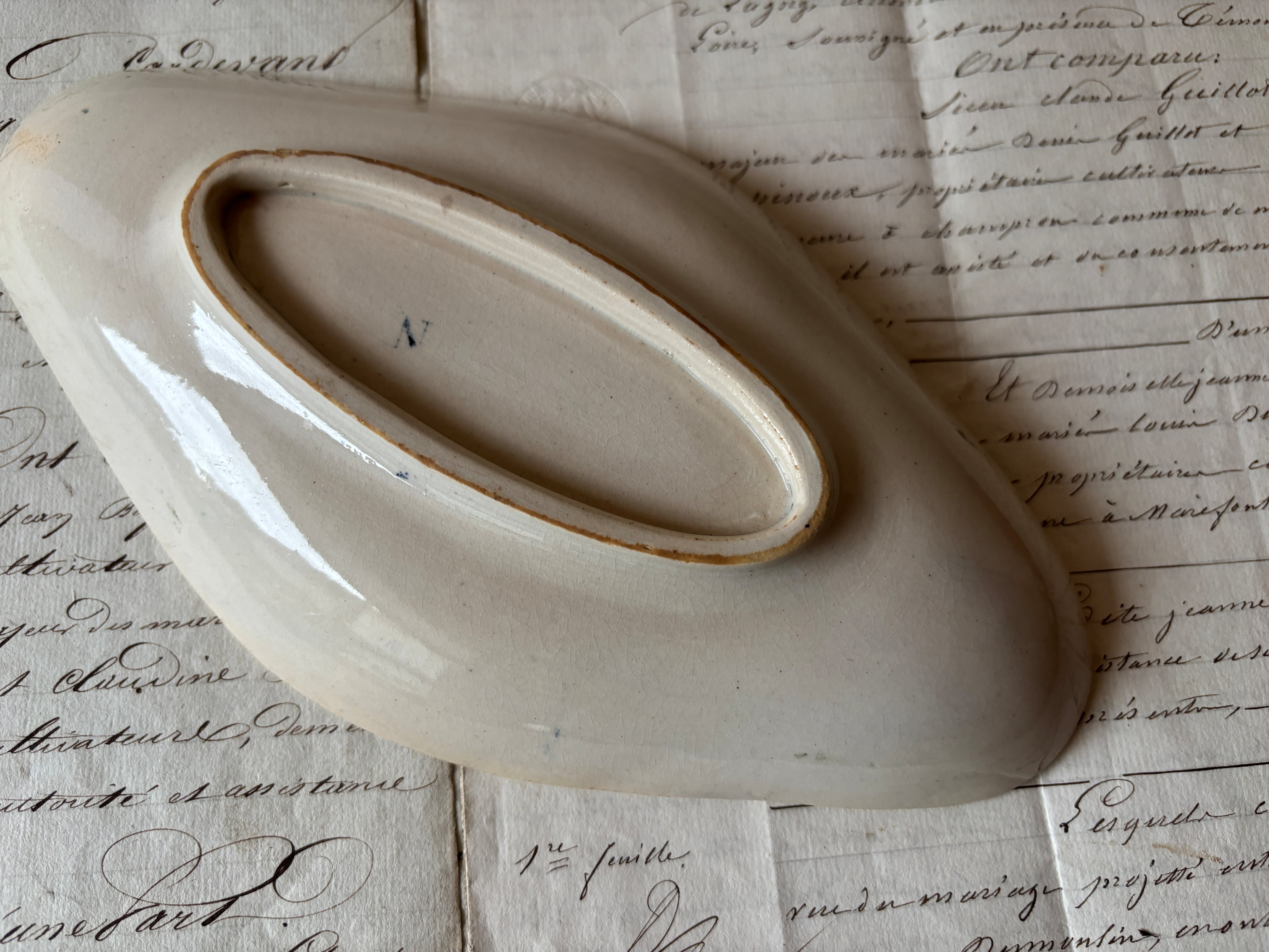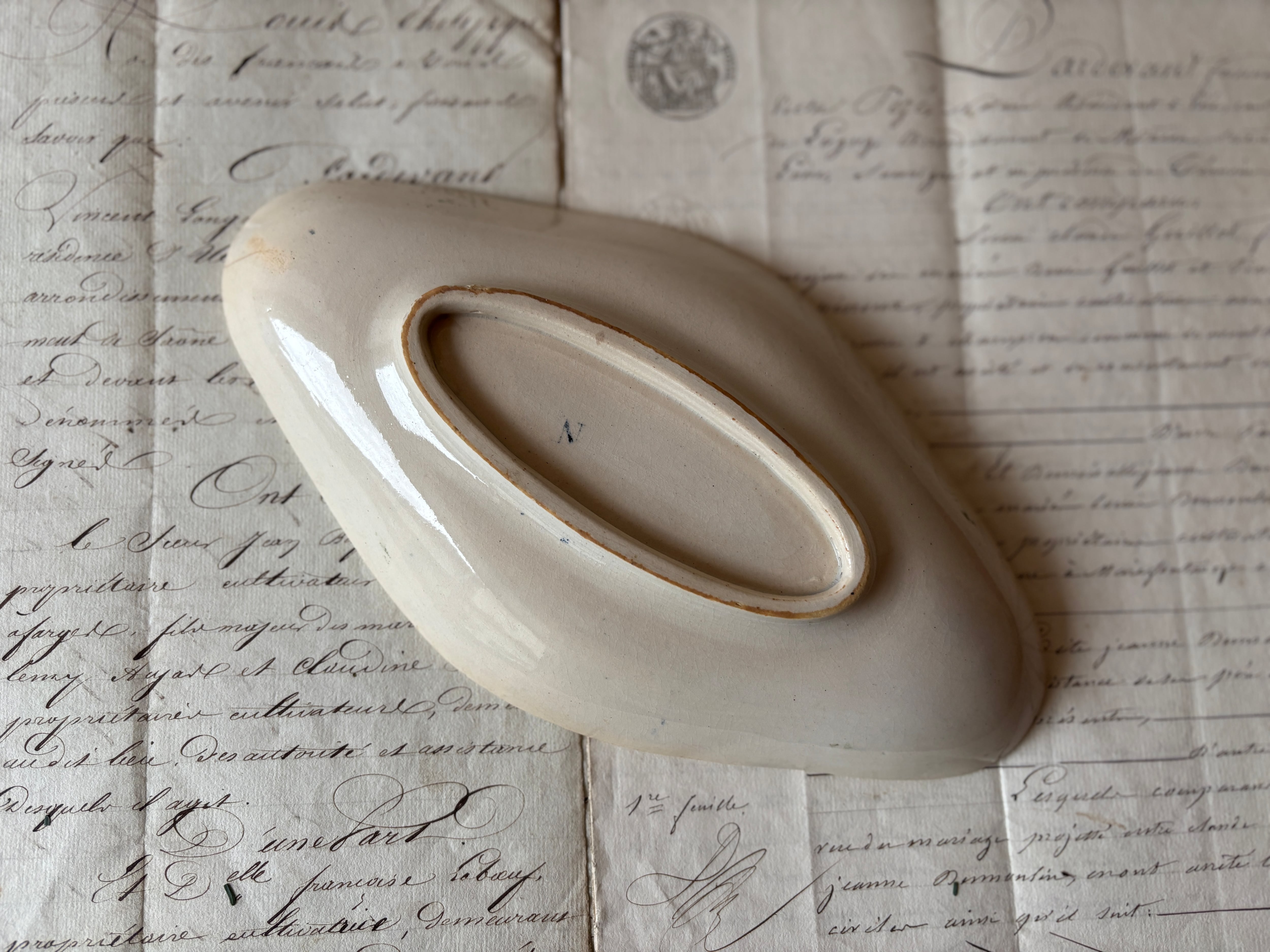 窯元は定かではありませんが、その特徴的な絵付けやリムの装飾から、歴史あるクレイユモントローやサルグミンヌなどの作と推測されます。