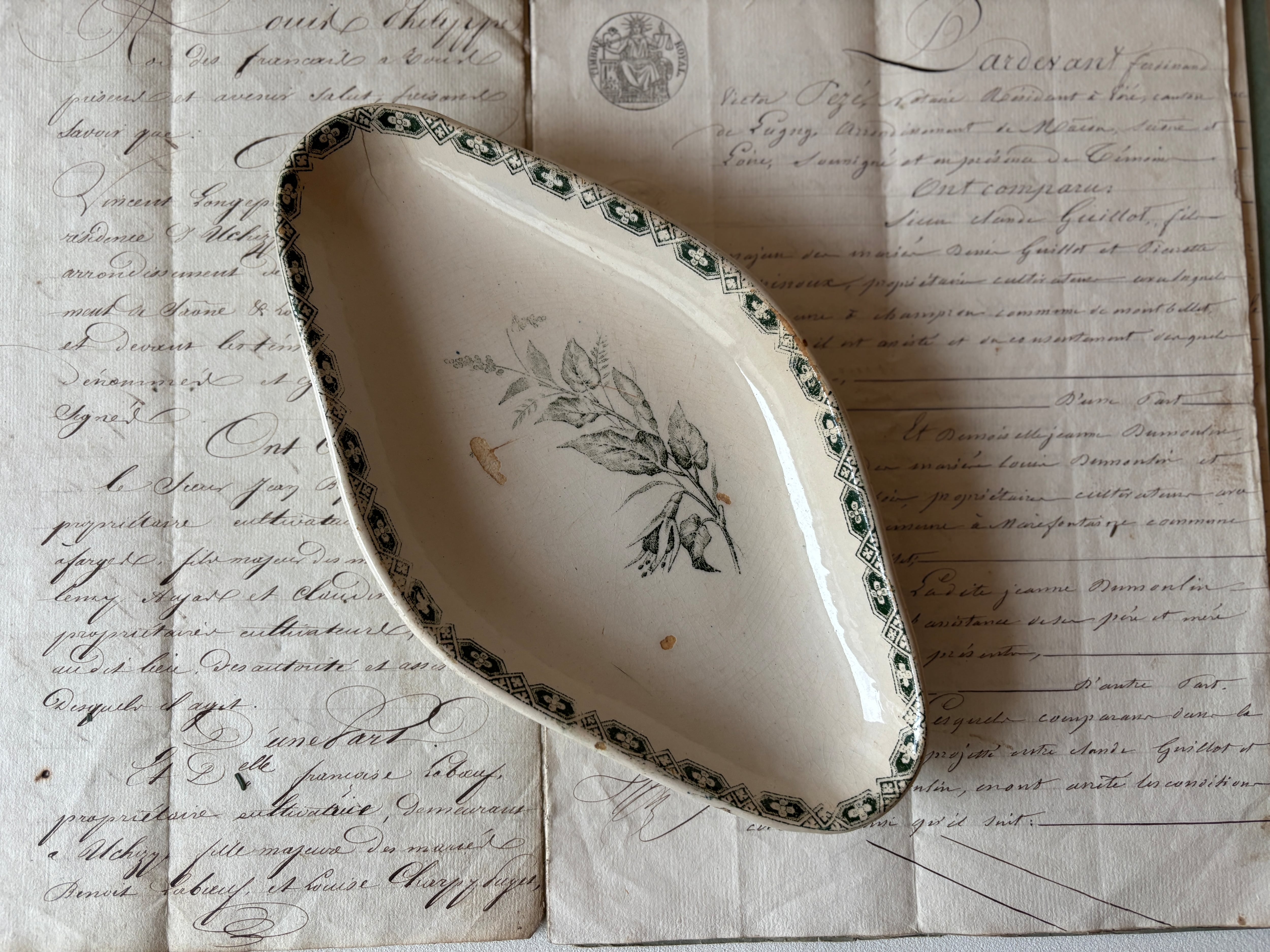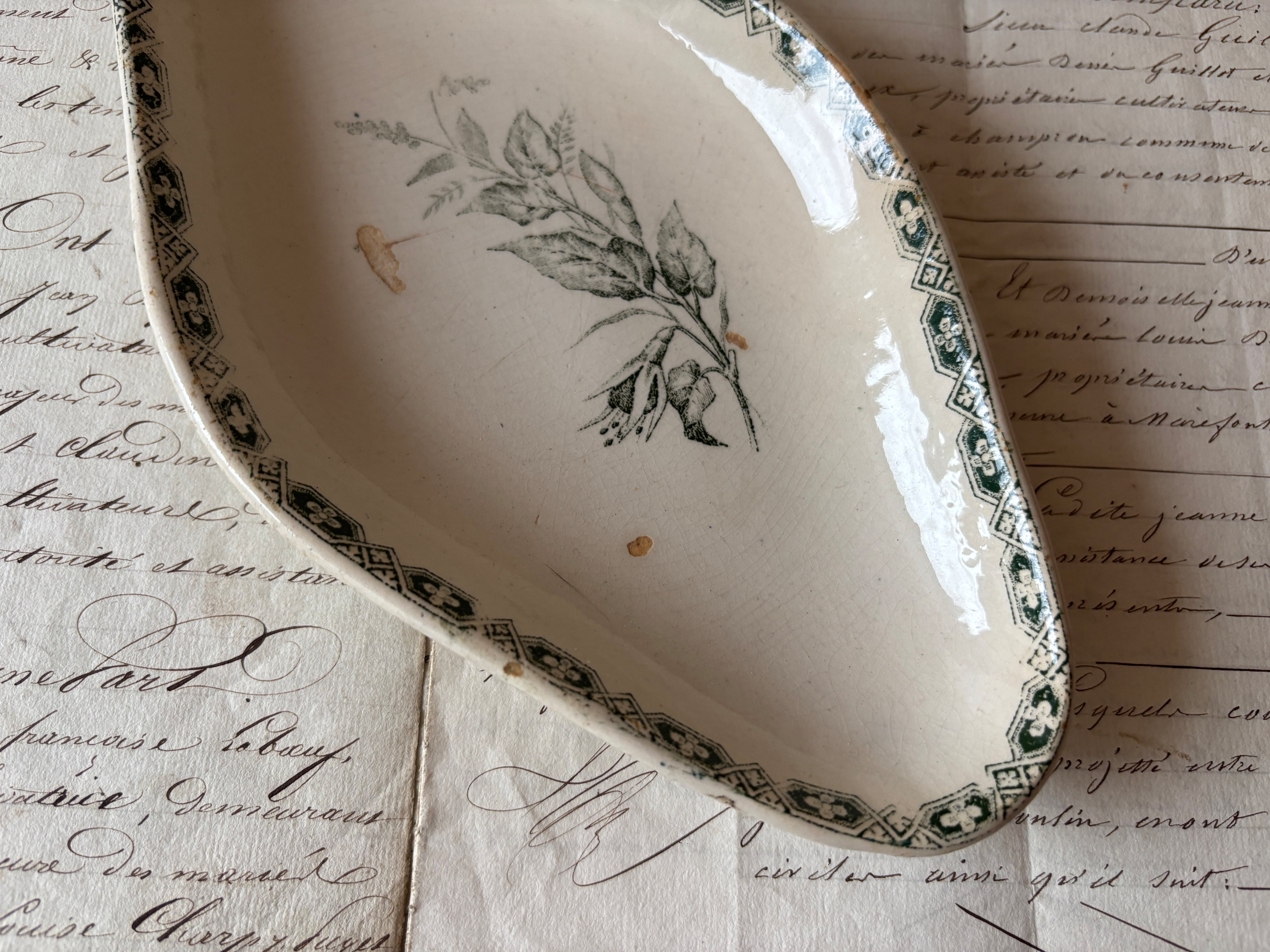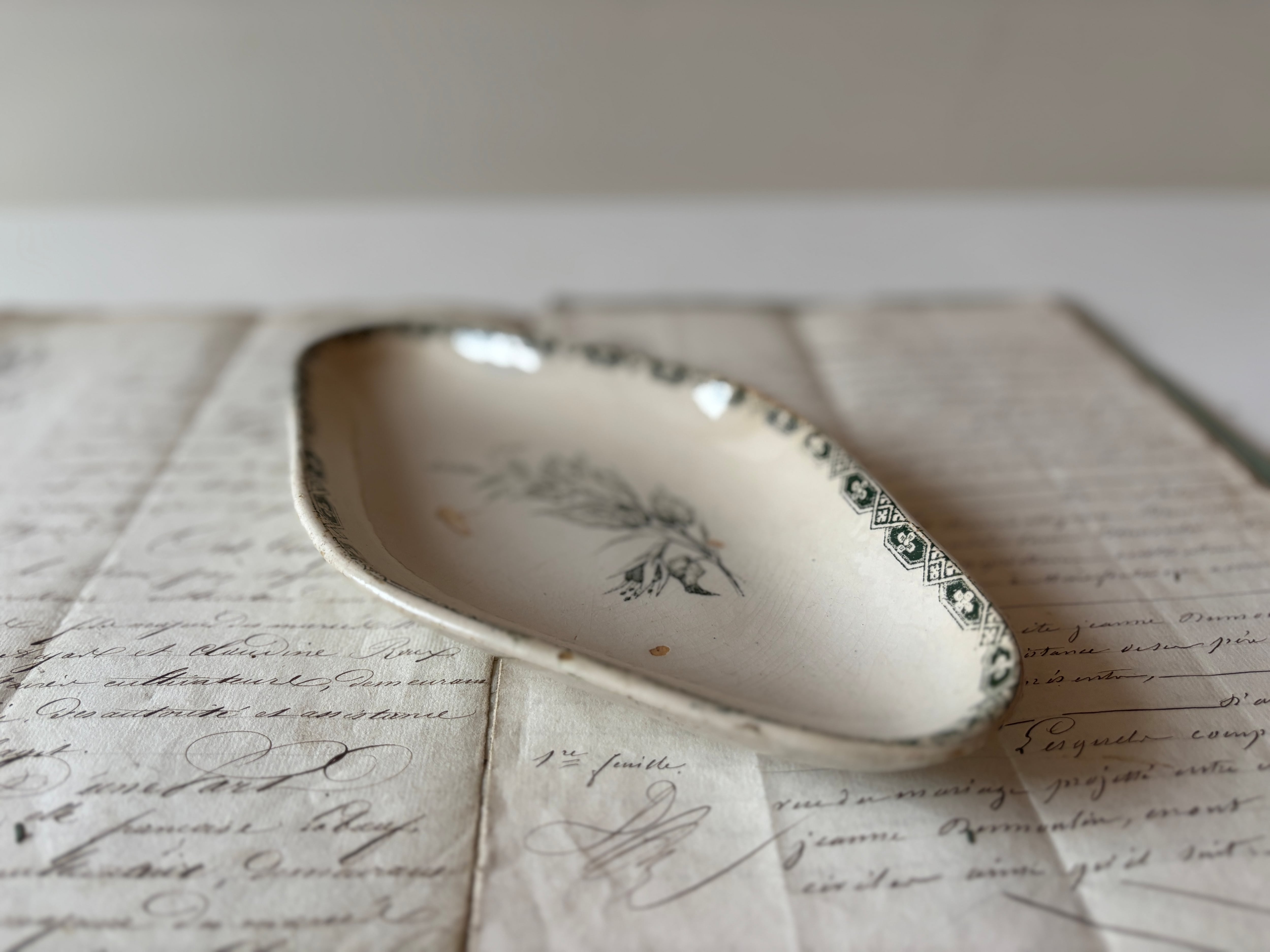 フランスアンティーク 繊細な一輪の花のラヴィエ グリーン フランスアンティーク皿