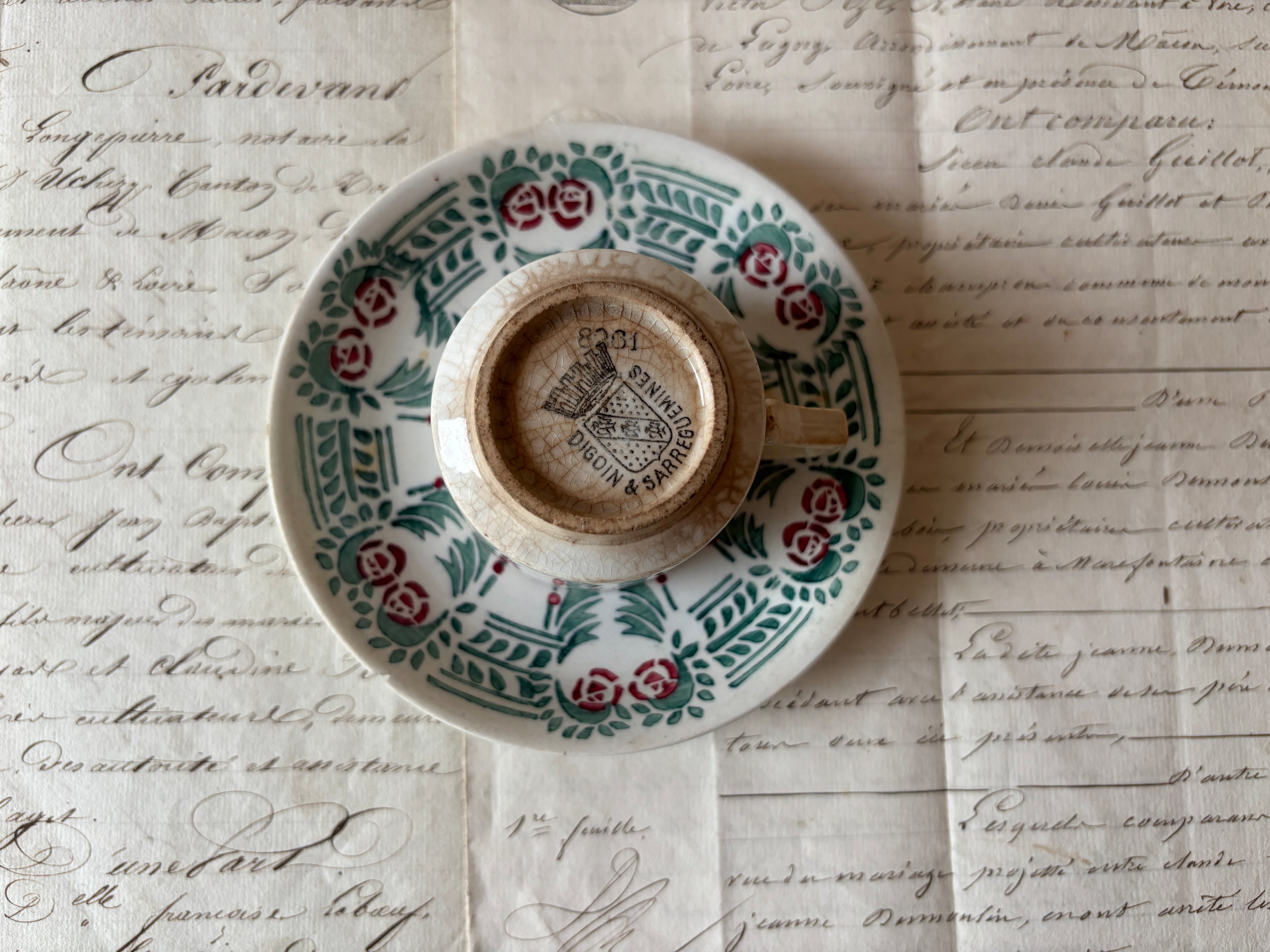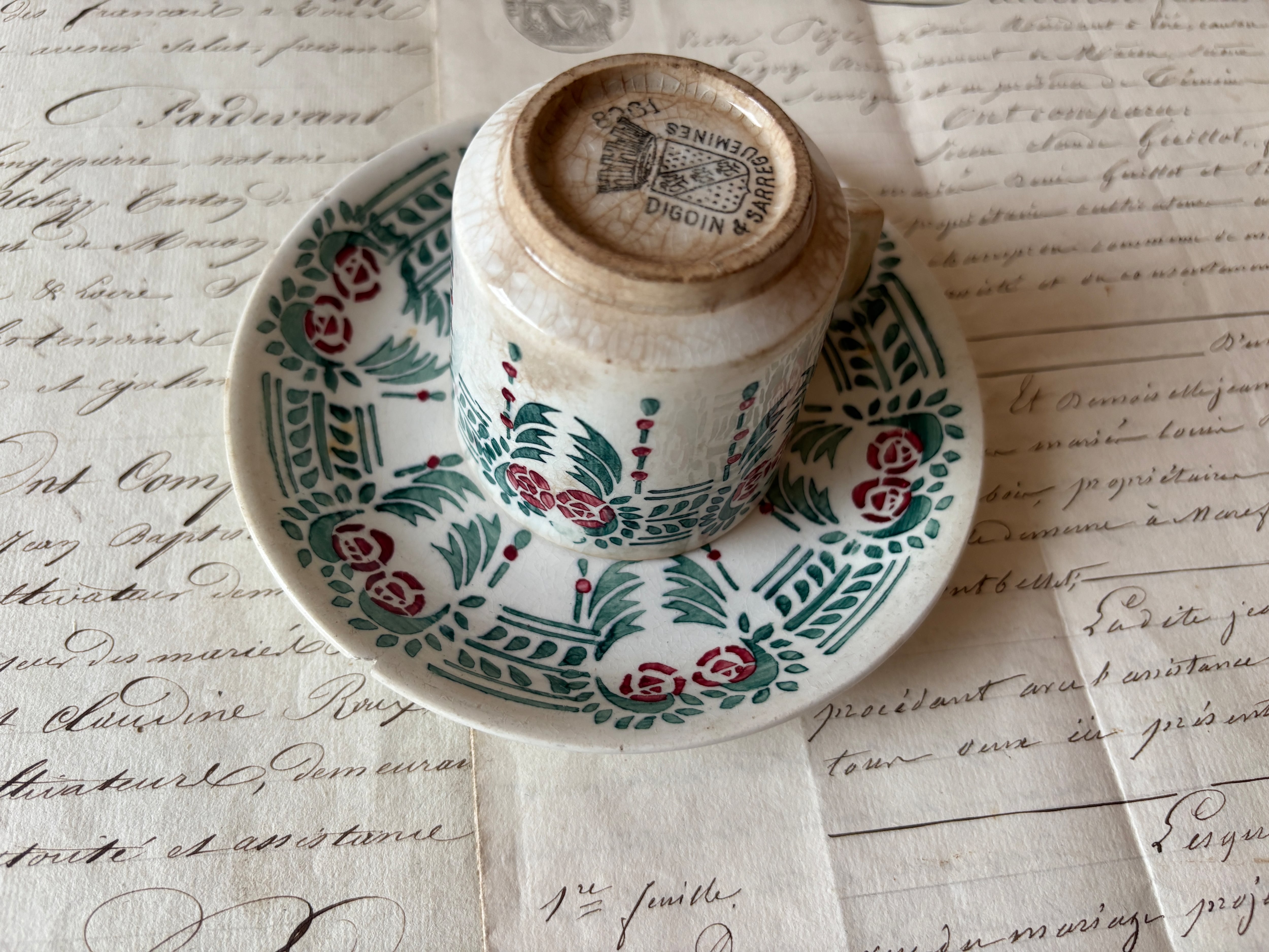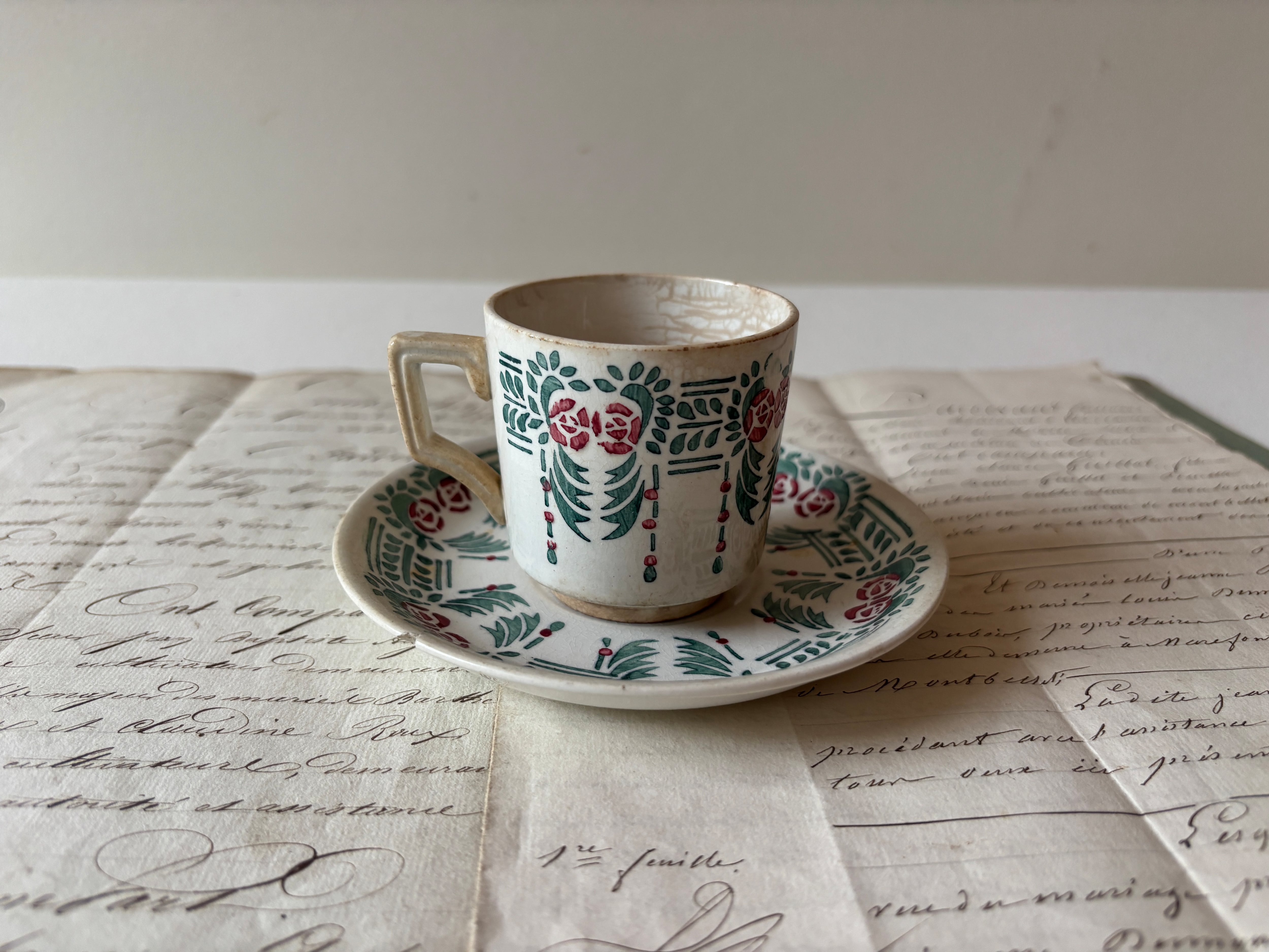 サルグミンヌ(Sarreguemines)より、可憐なミニバラとシャンデリアのような装飾が描かれた、デミタスカップ&ソーサーが届きました。
