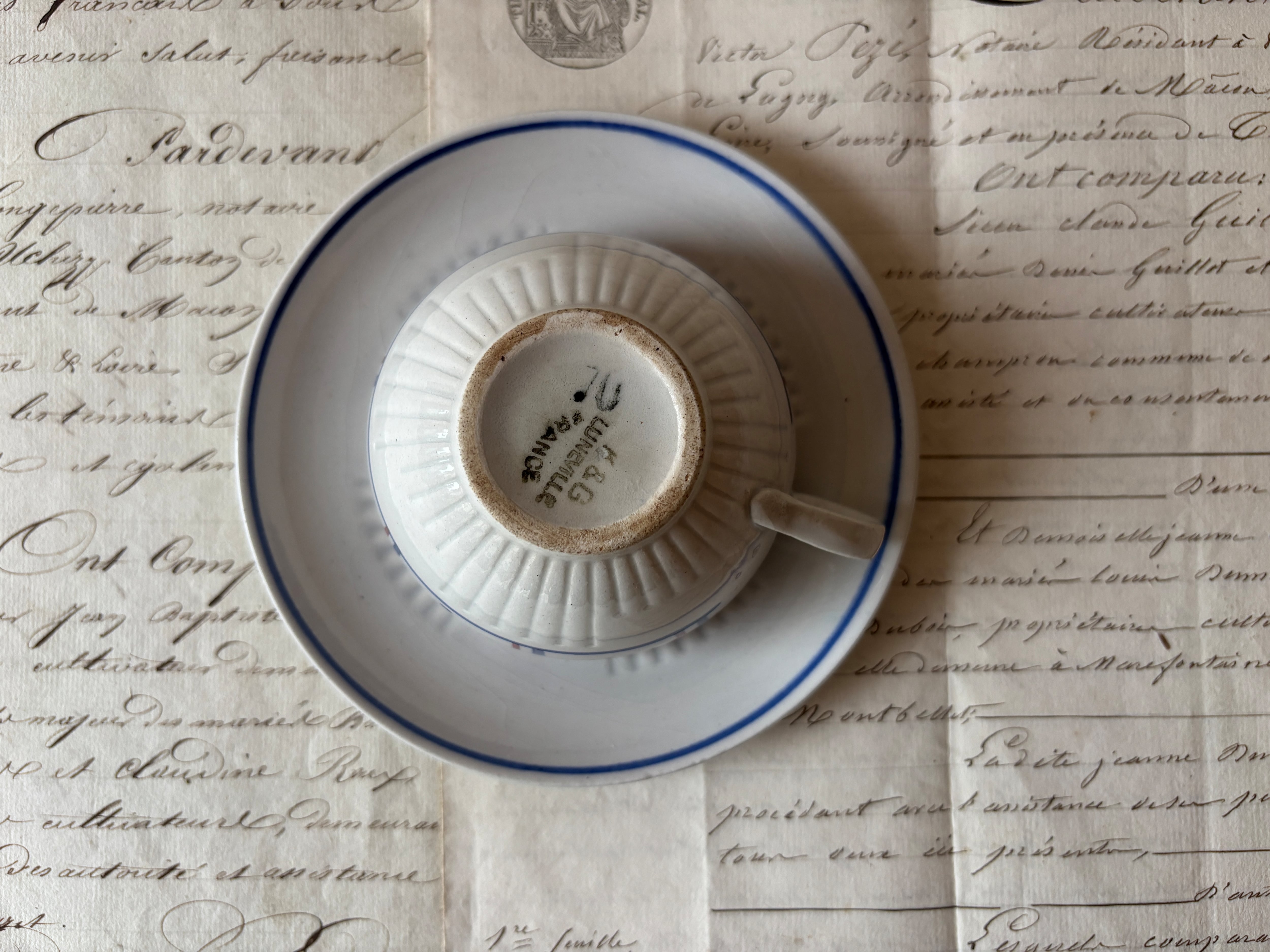 リュネヴィル(K&G Luneville)より、フランスアンティークの定番ともいえる「バスク柄」のキャッチーなコーヒーカップ&ソーサーが届きました。