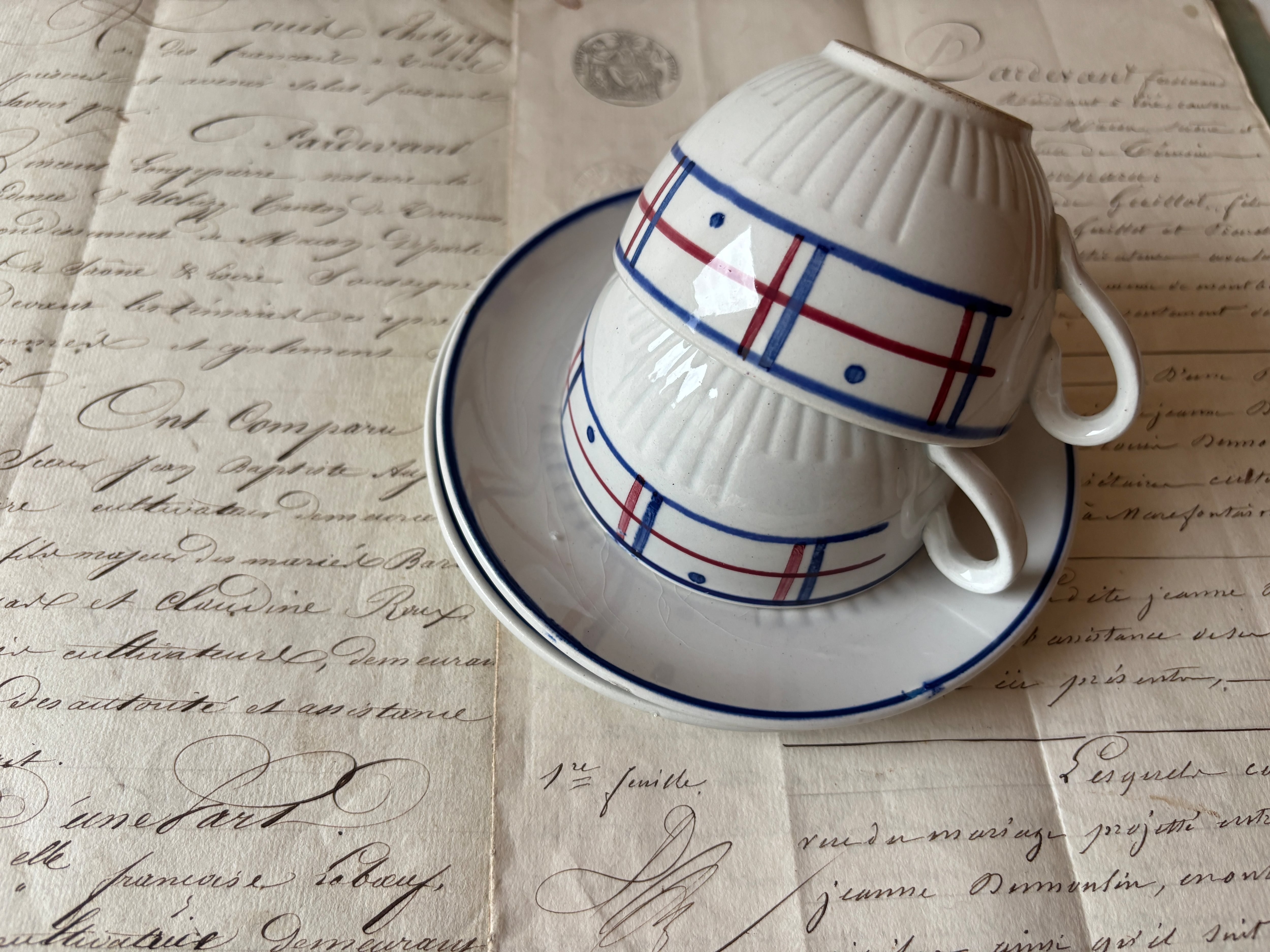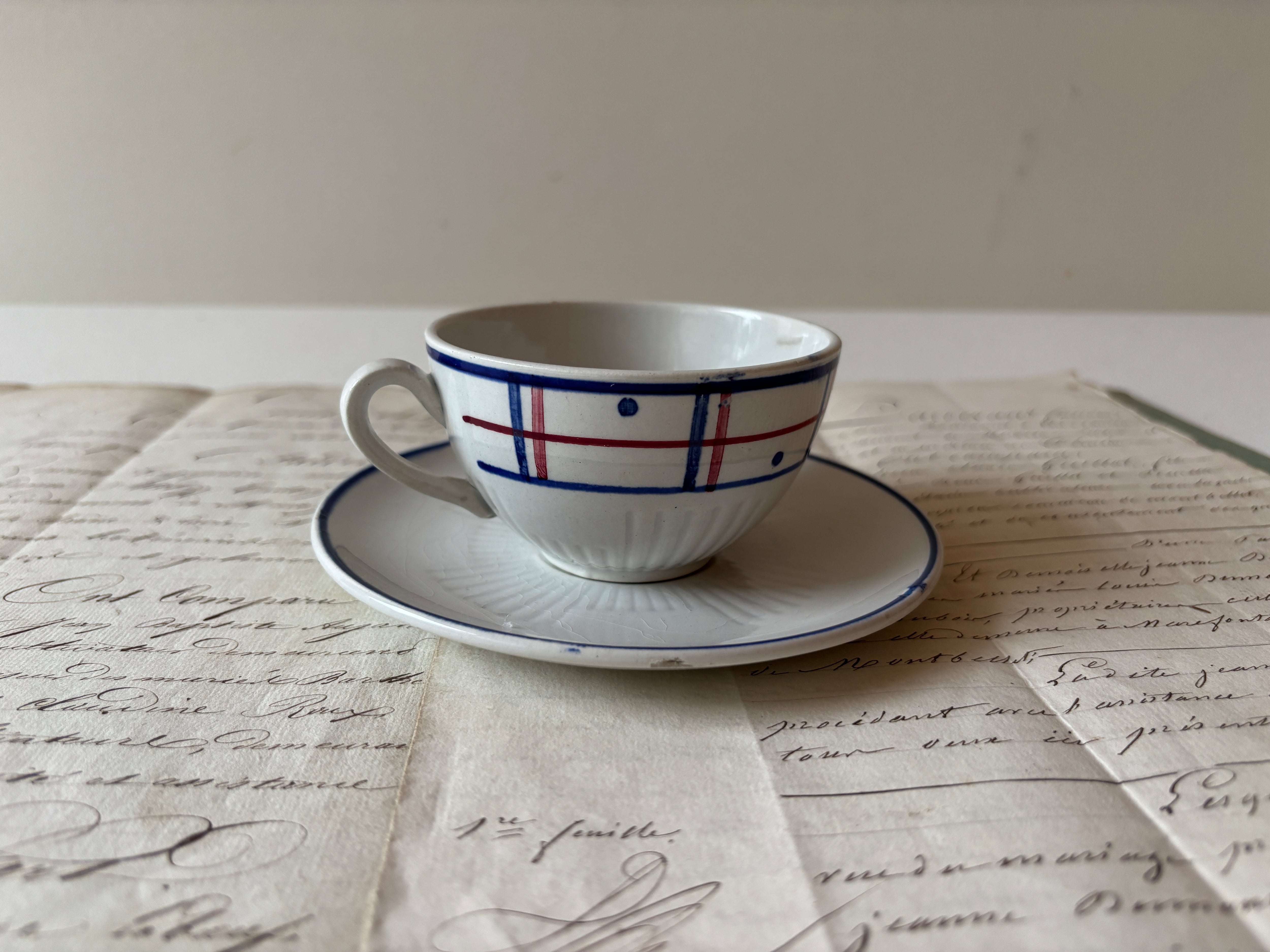 リュネヴィル(K&G Luneville)より、フランスアンティークの定番ともいえる「バスク柄」のキャッチーなコーヒーカップ&ソーサーが届きました。