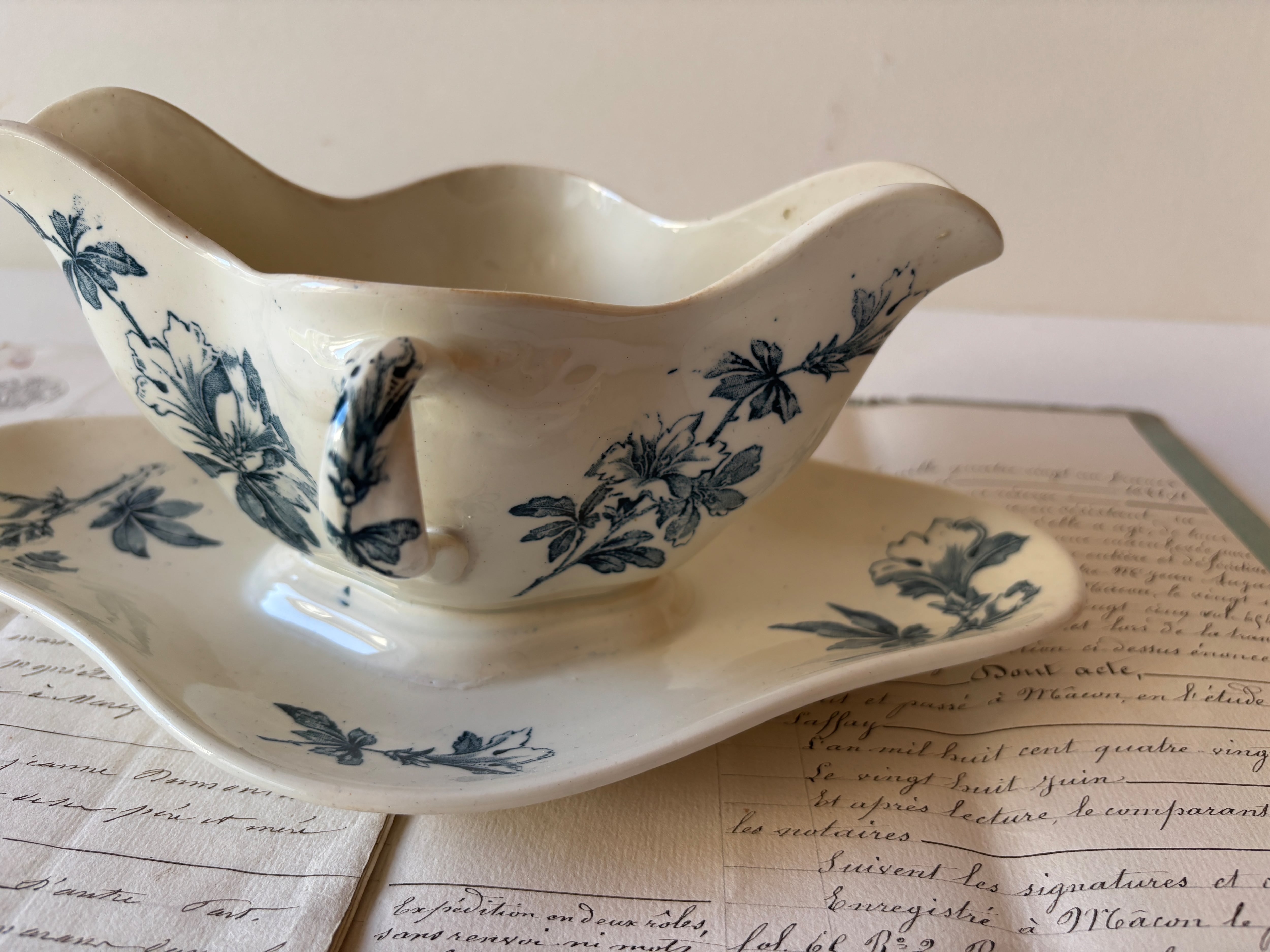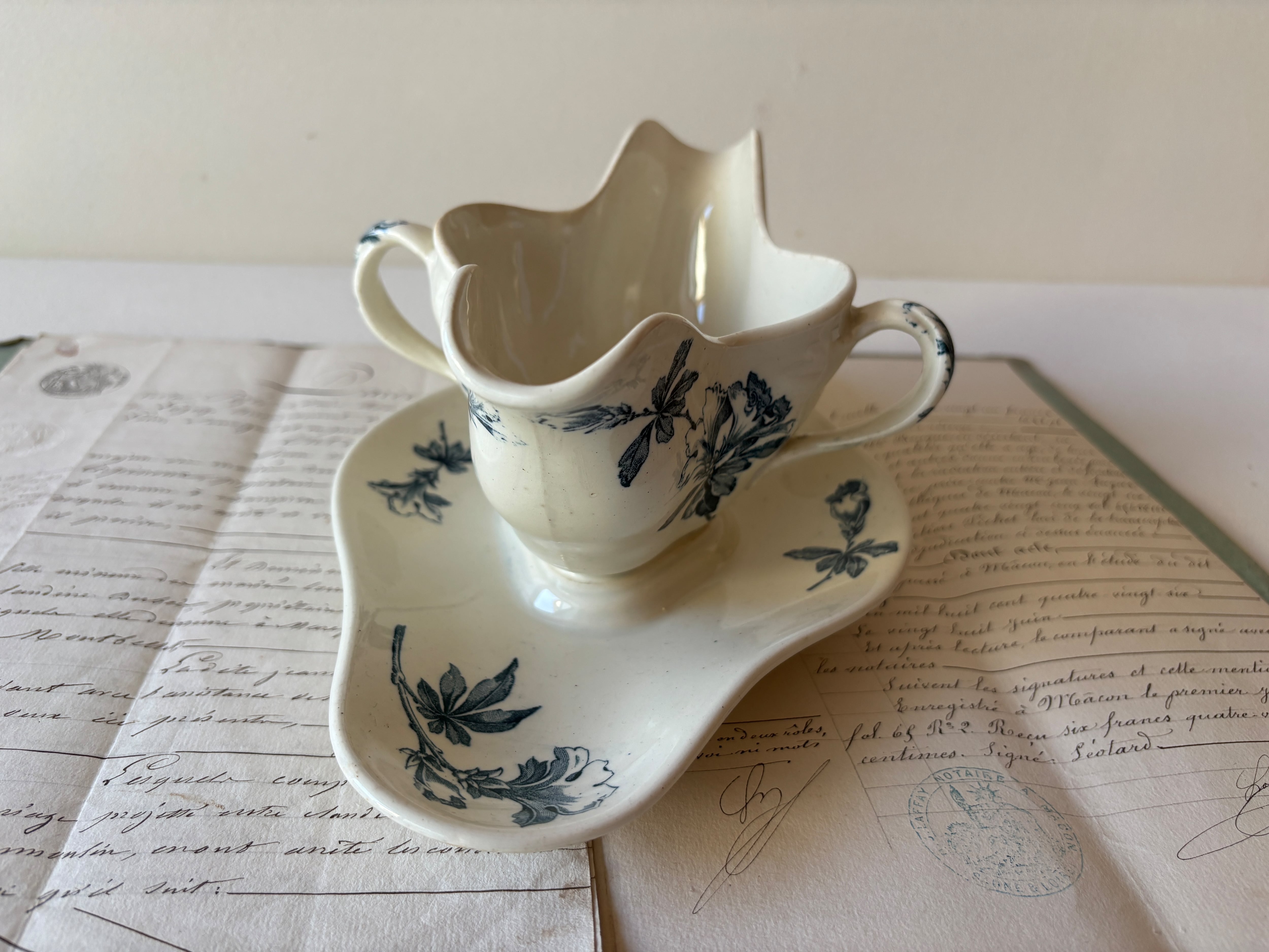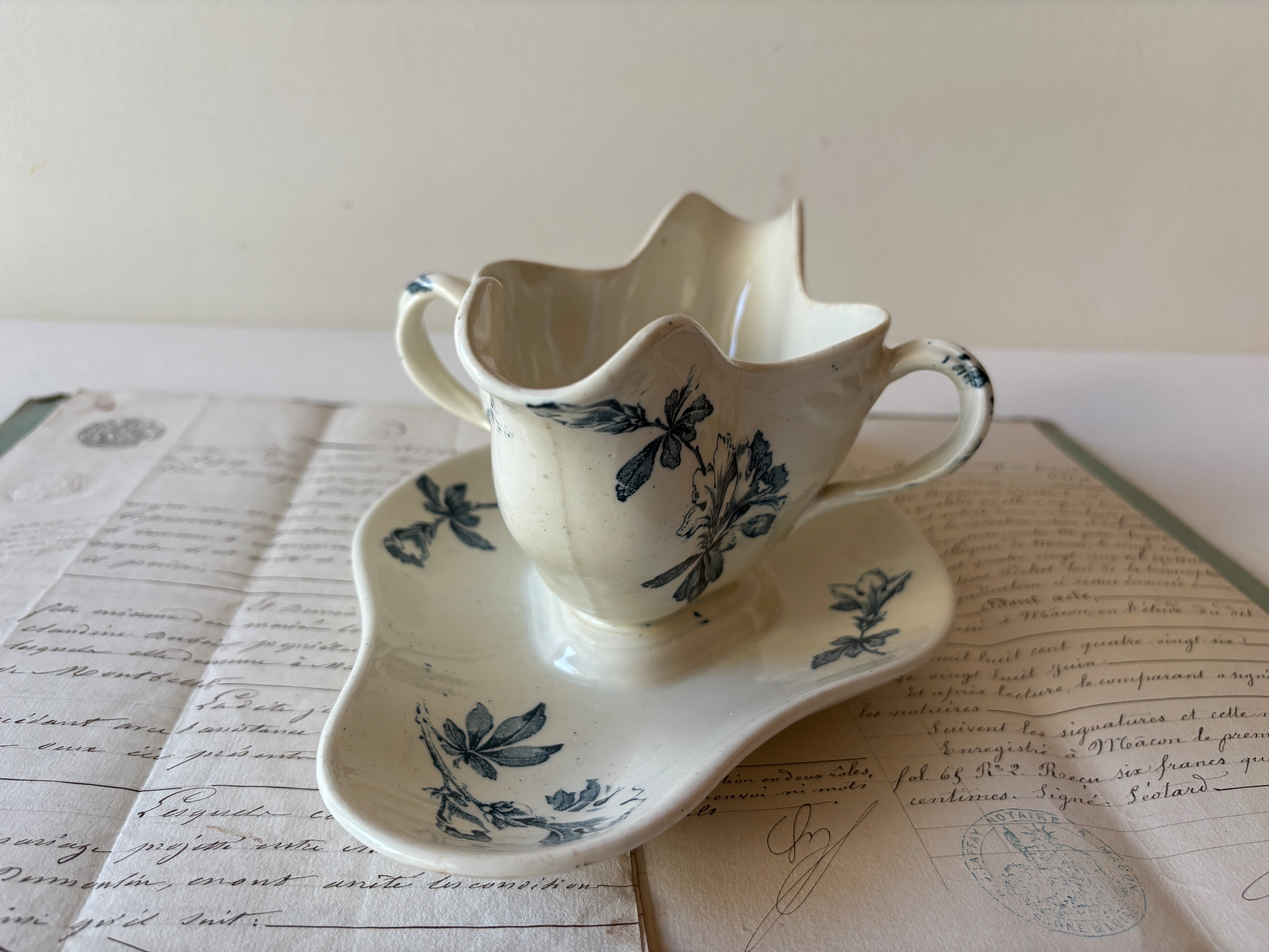 フランス、リュネヴィル窯より、可憐な花柄と珍しいハンドル付きのフォルムが目を惹くソーシエールが届きました。