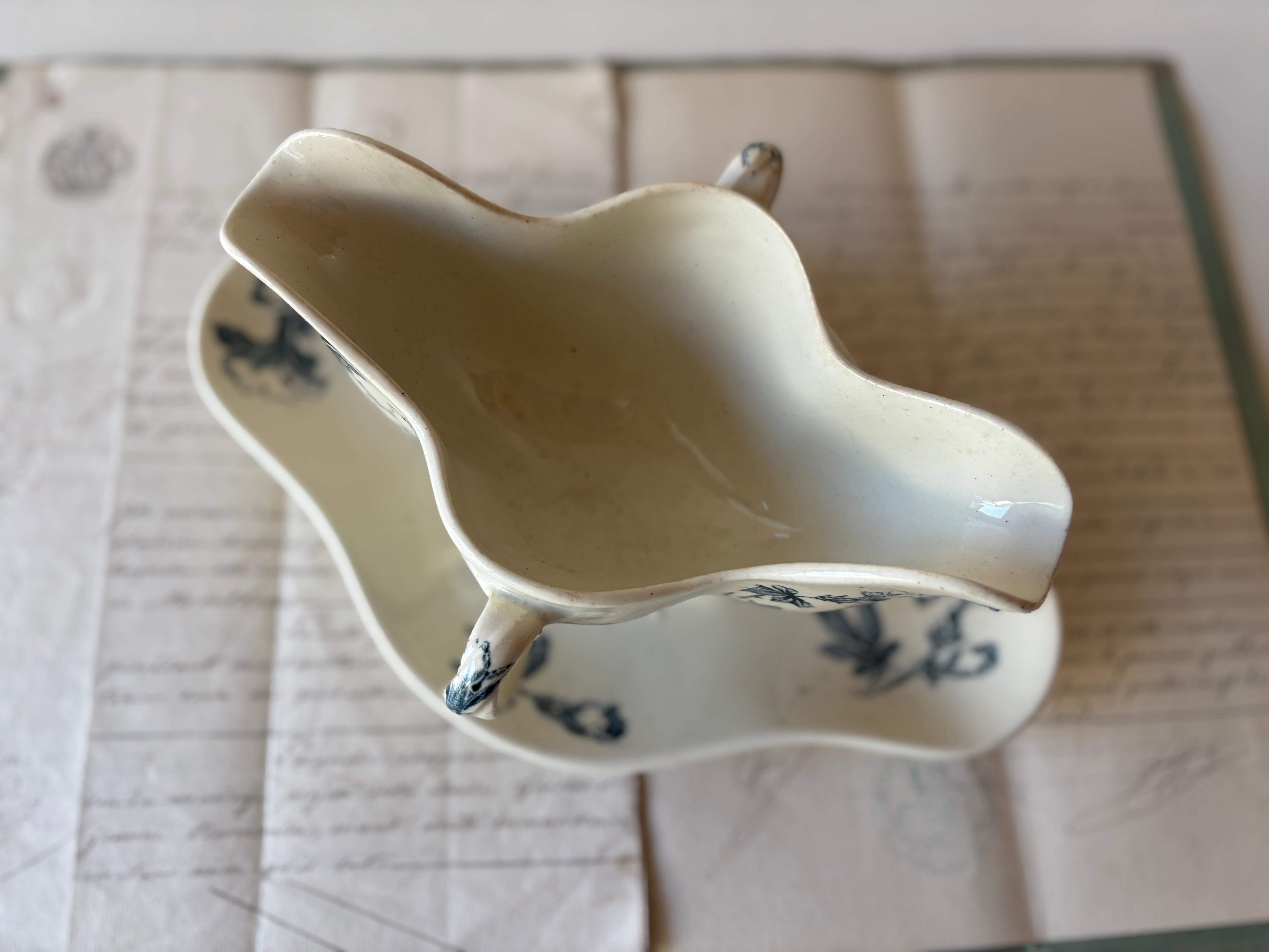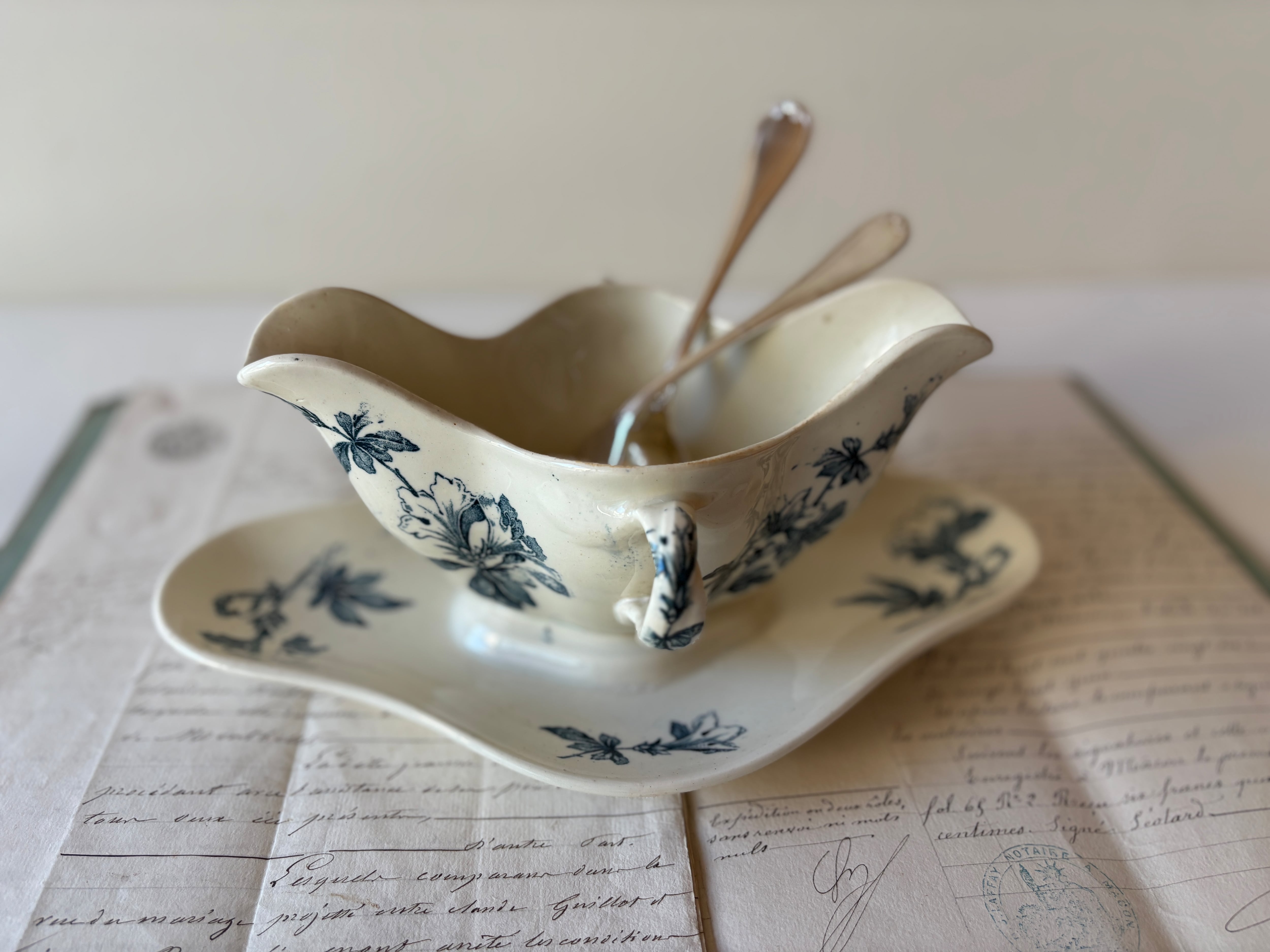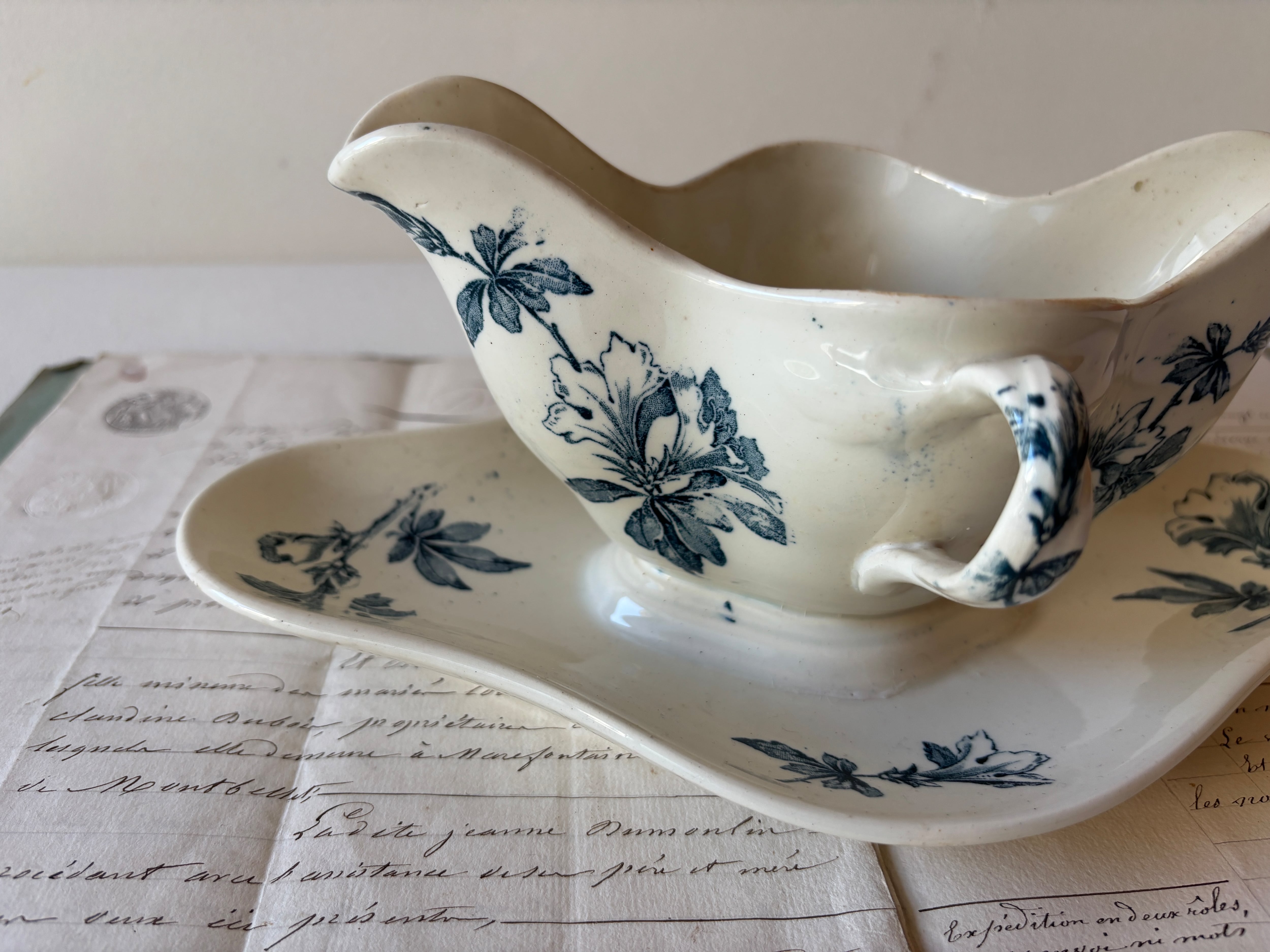 フランス、リュネヴィル窯より、可憐な花柄と珍しいハンドル付きのフォルムが目を惹くソーシエールが届きました。